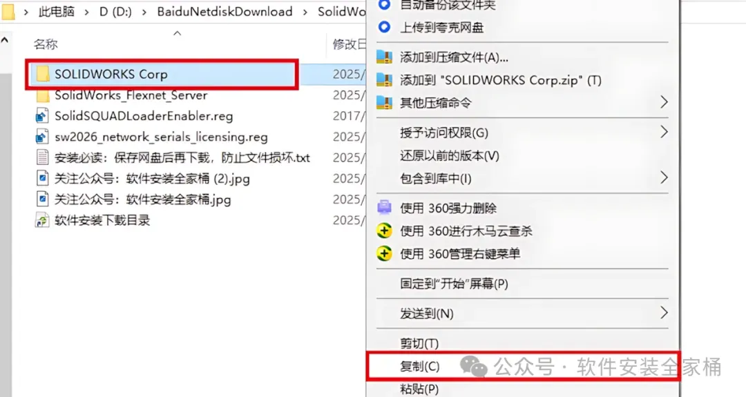 25、继续选择已打开的文件夹,选择【SolidWorks Corp】文件夹,右击选择【复制】。