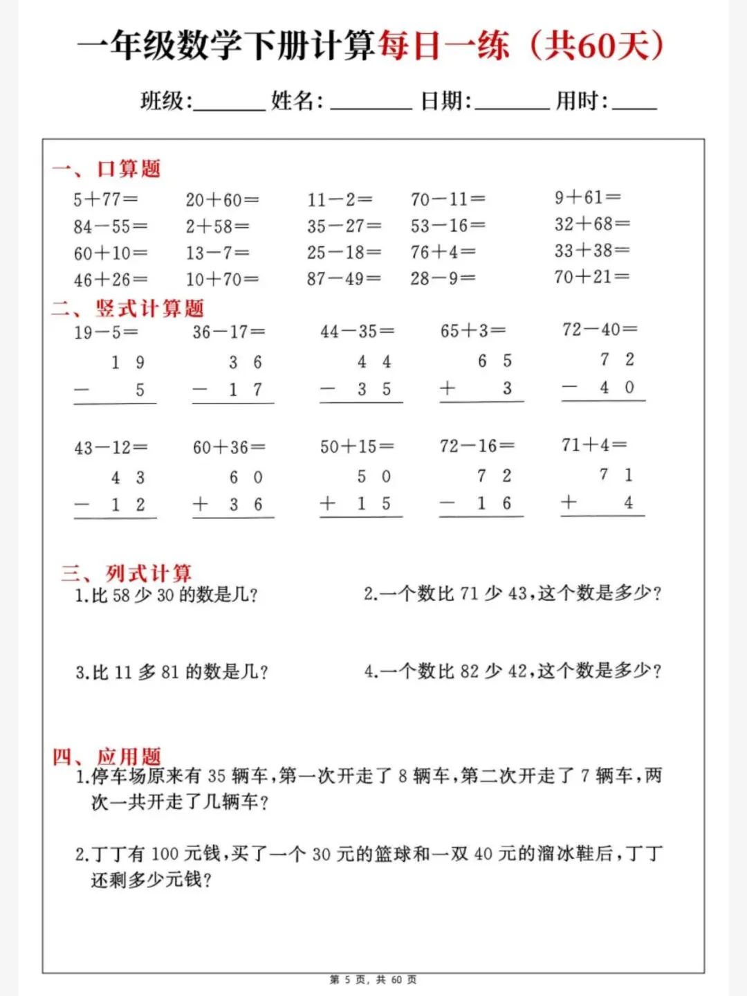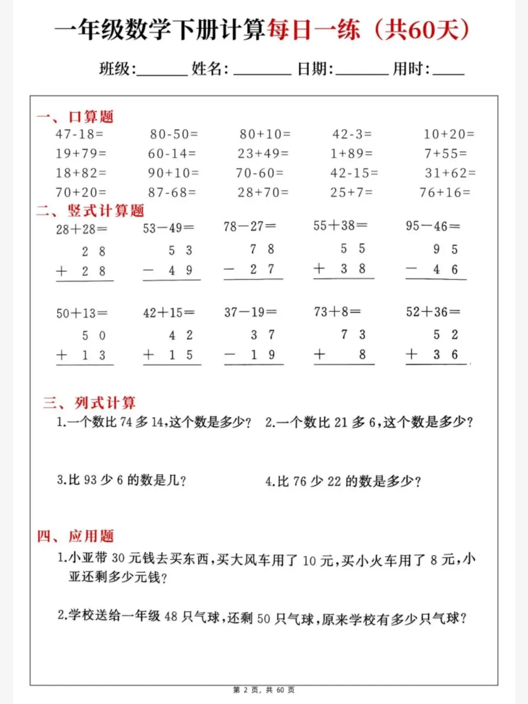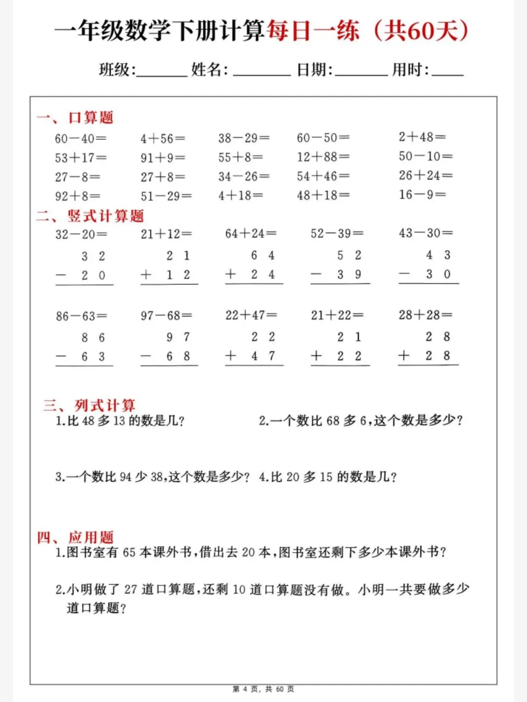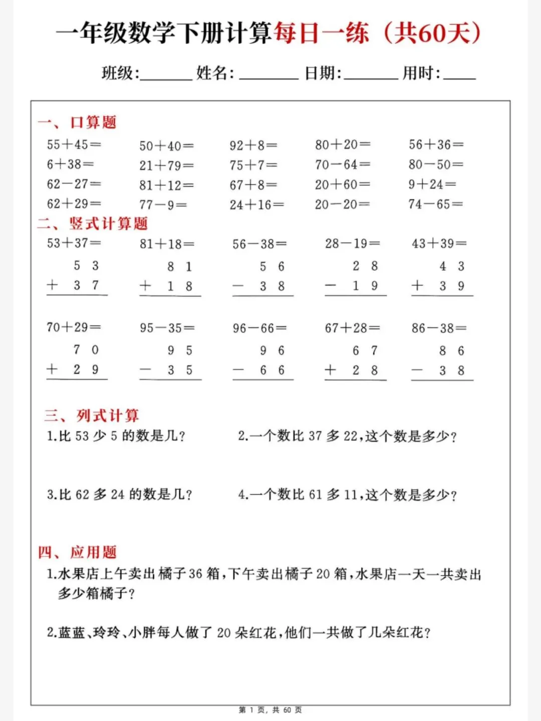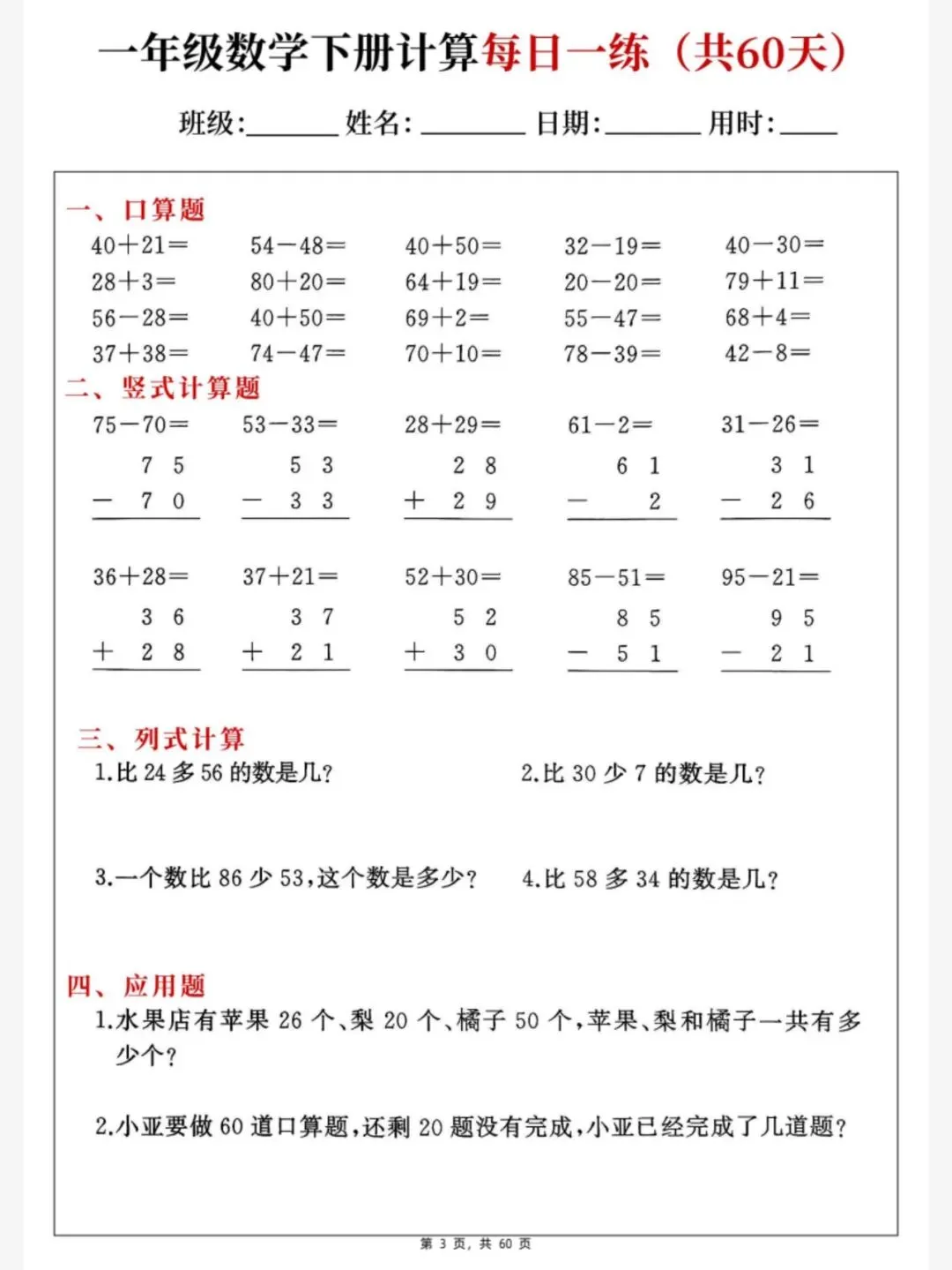 今天给大家分享:26春一年级下册数学计算每日一练,一共60页。