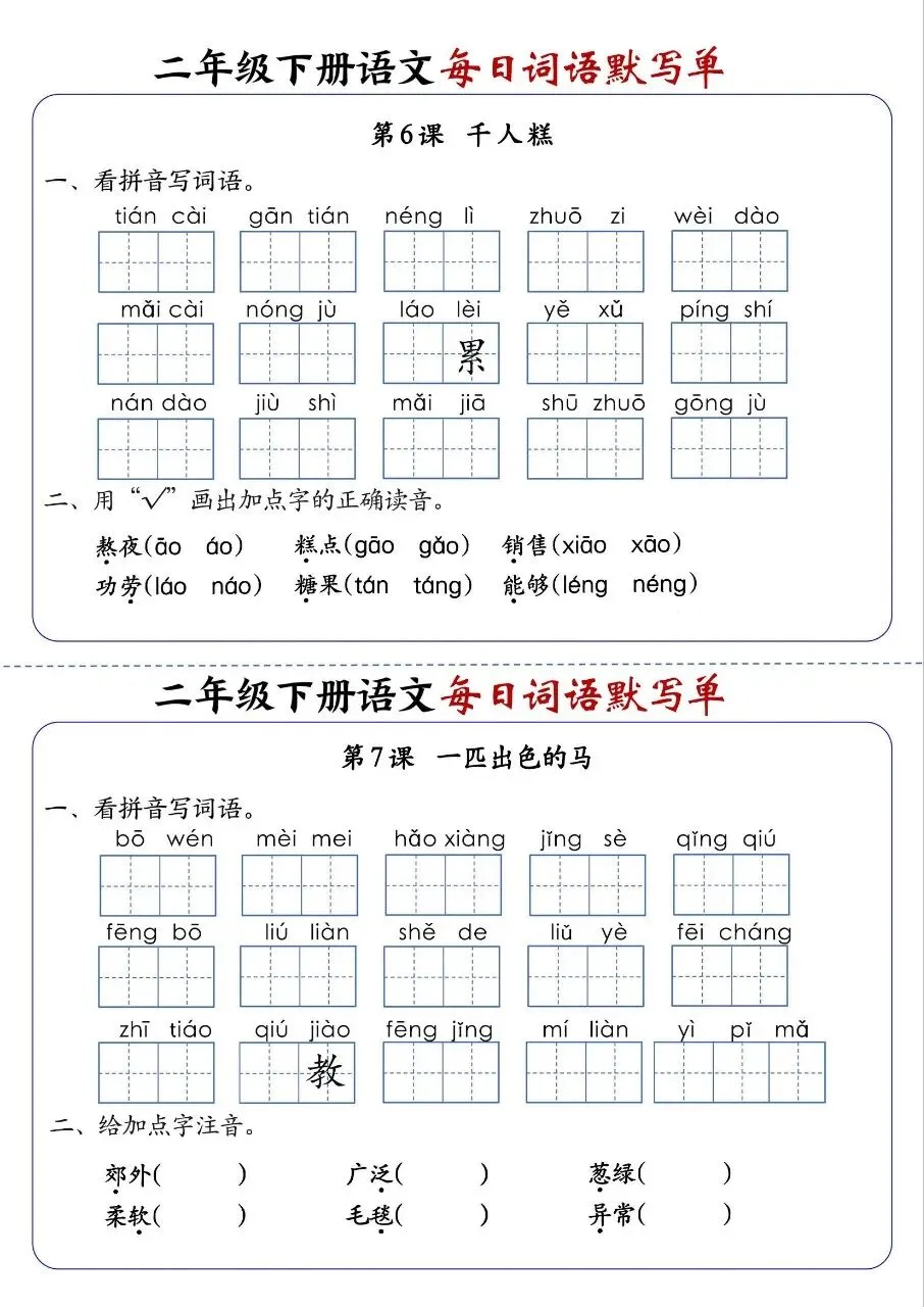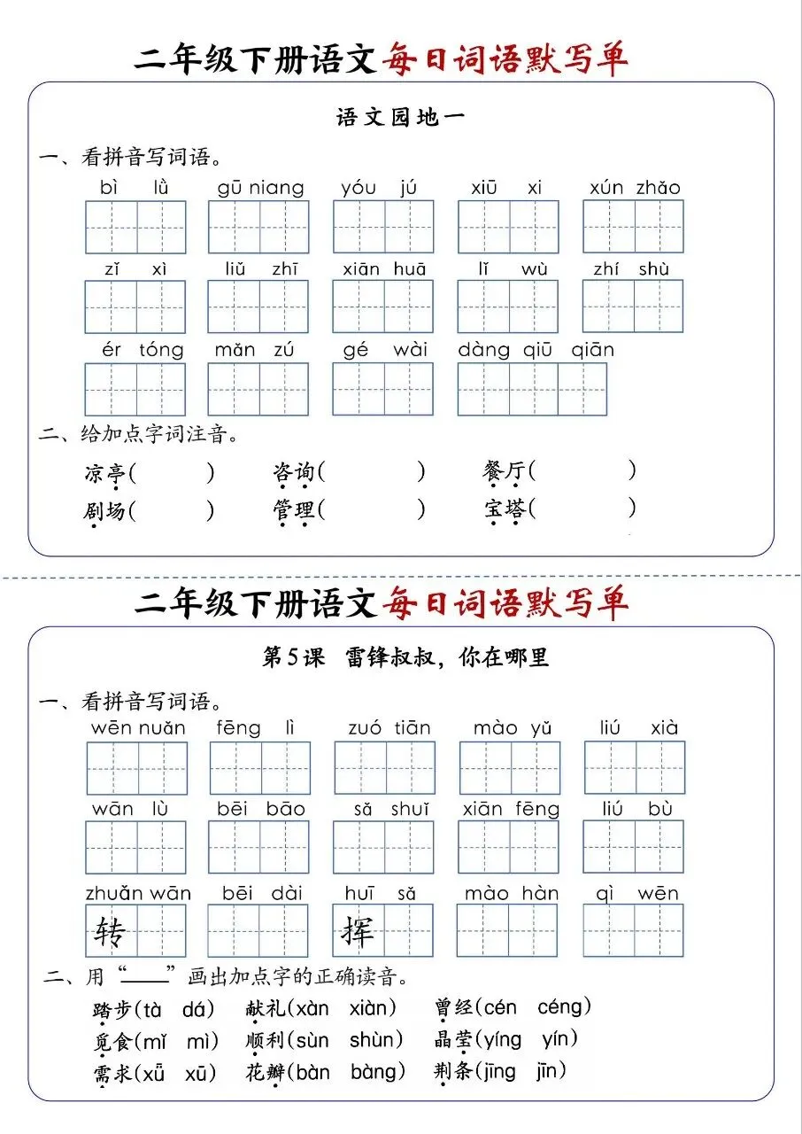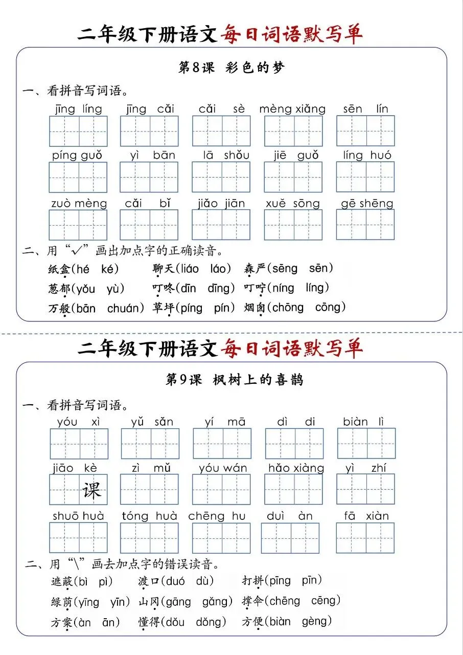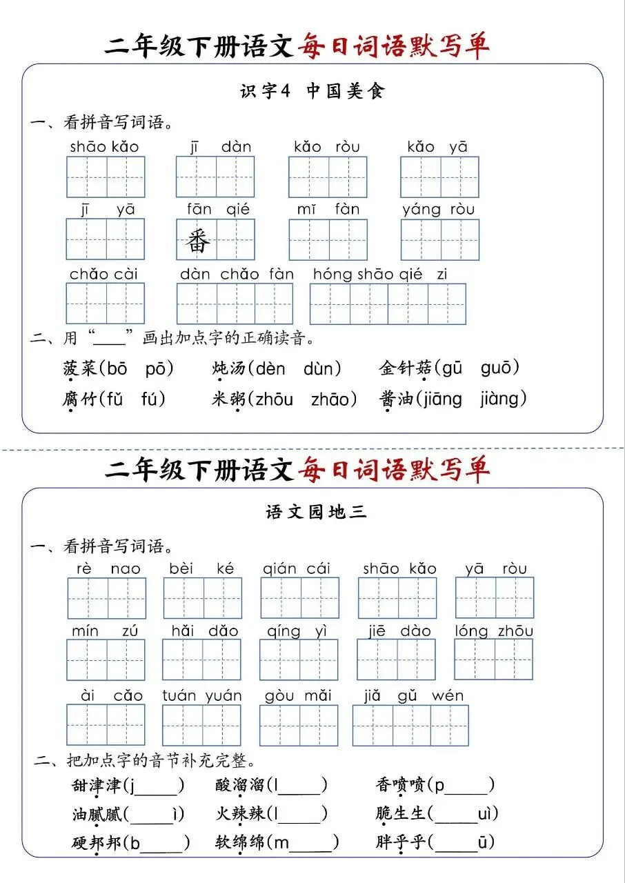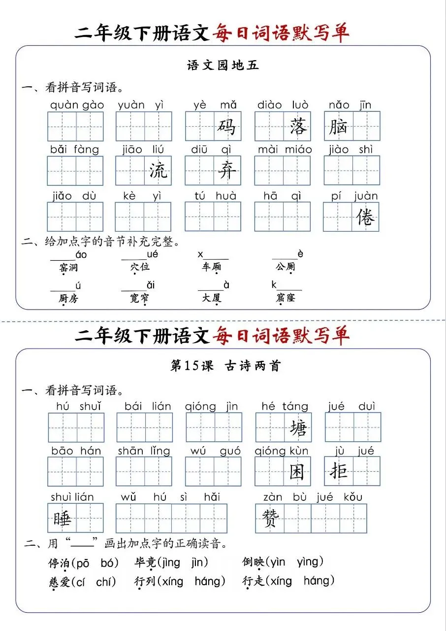 二年级下册语文每日词语默写单(完整电子版可打印)