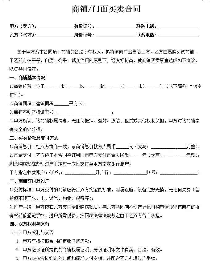 商铺/门面买卖合同