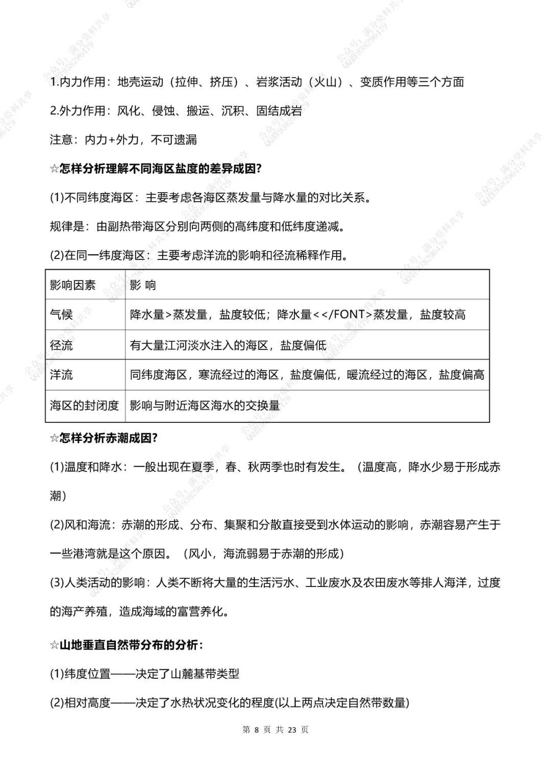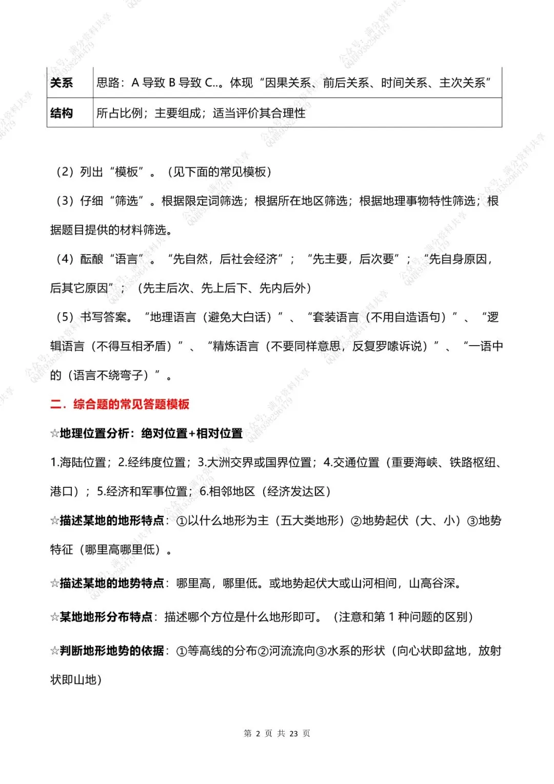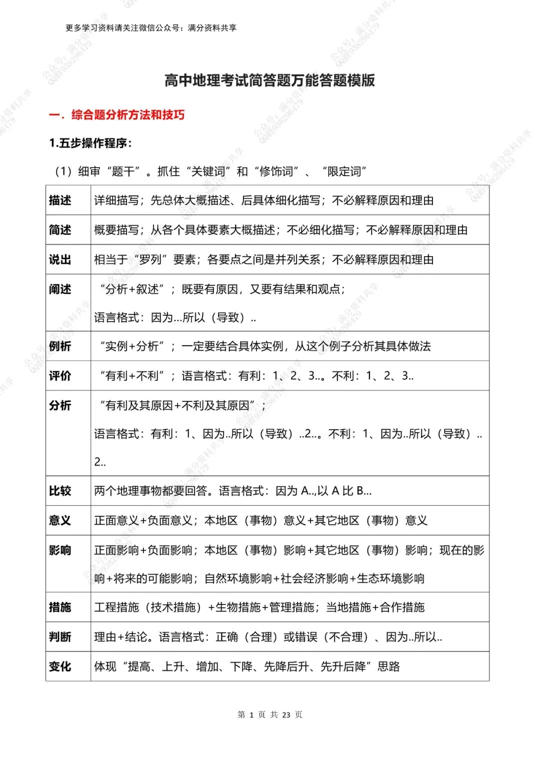 高中地理考试简答题万能答题模版(pdf分享) 点击图片可观看高清版,文末有获取打印版方式 (完整版23页,部分展示) 领取完整电子版: ①:点一点右下角的“赞”和“在看”,感谢! ②:点击“关注”回复“高中资料”获取资料 点击下方“公众号”关注,可以进入主页哦!