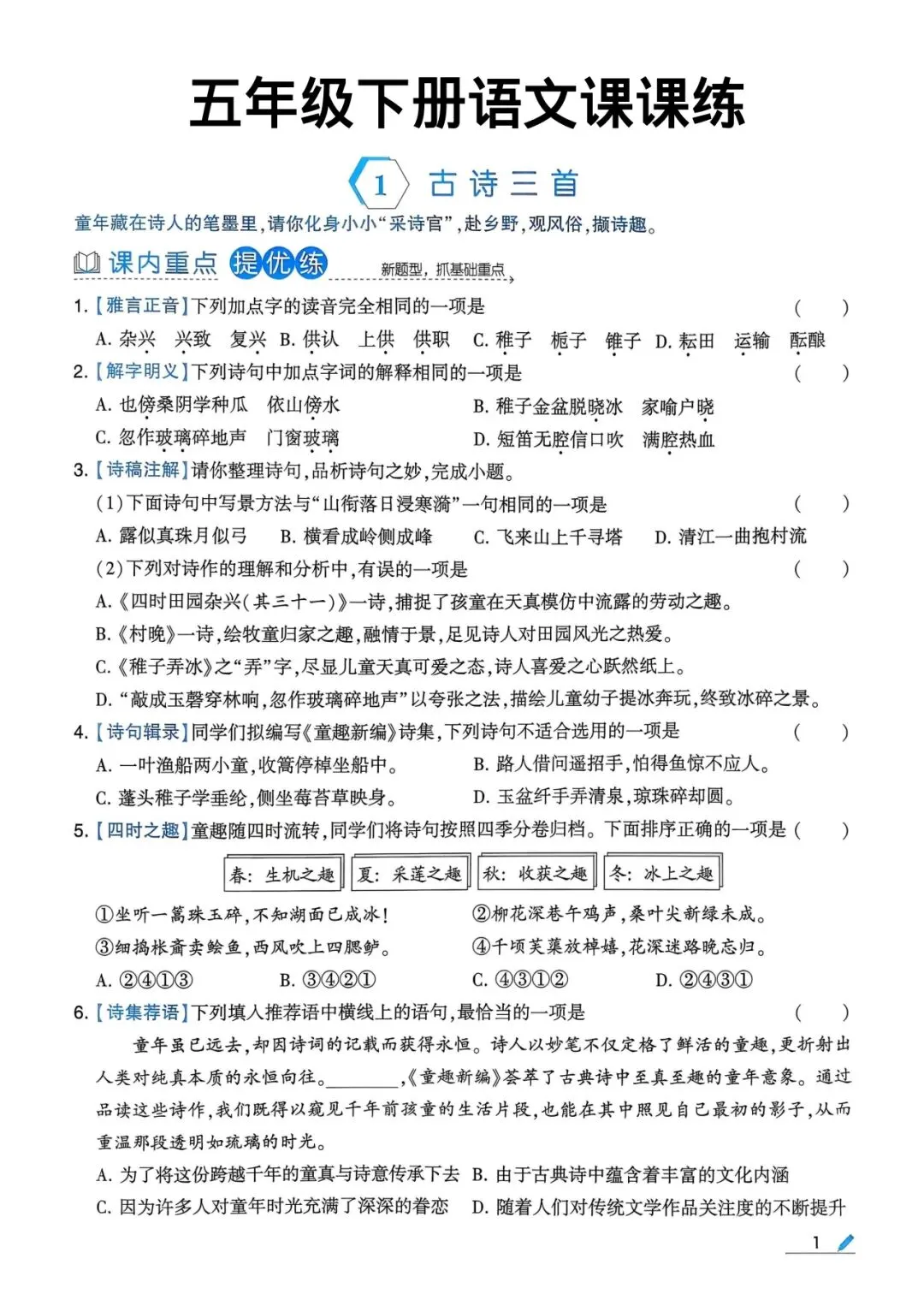 五年级下册语文同步学习,一课一练很关键!紧跟教材、夯实字词、突破阅读、巩固考点,帮孩子每天扎实进步,轻松应对单元测与期中期末。今天给大家整理全套语文课课练,同步课本、题型全面,家长可直接打印使用。