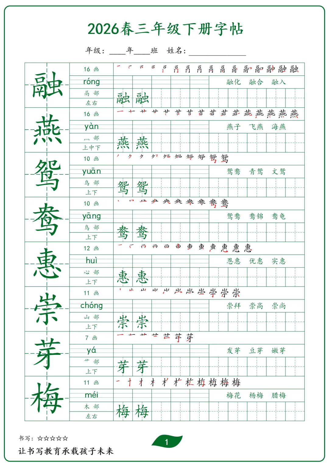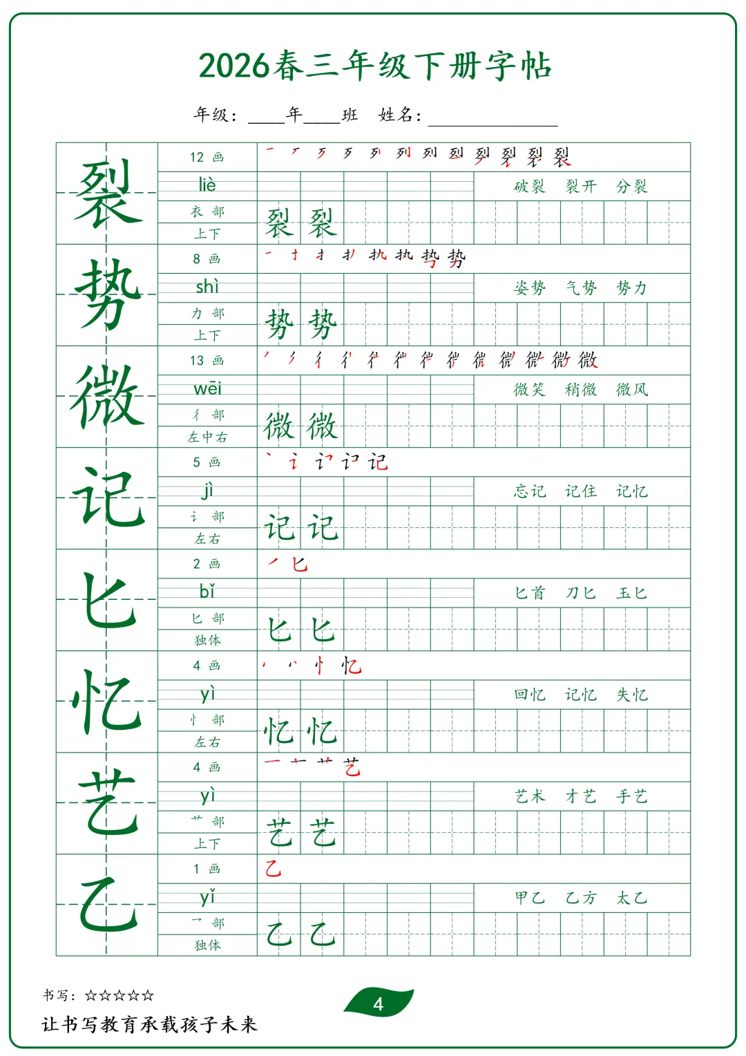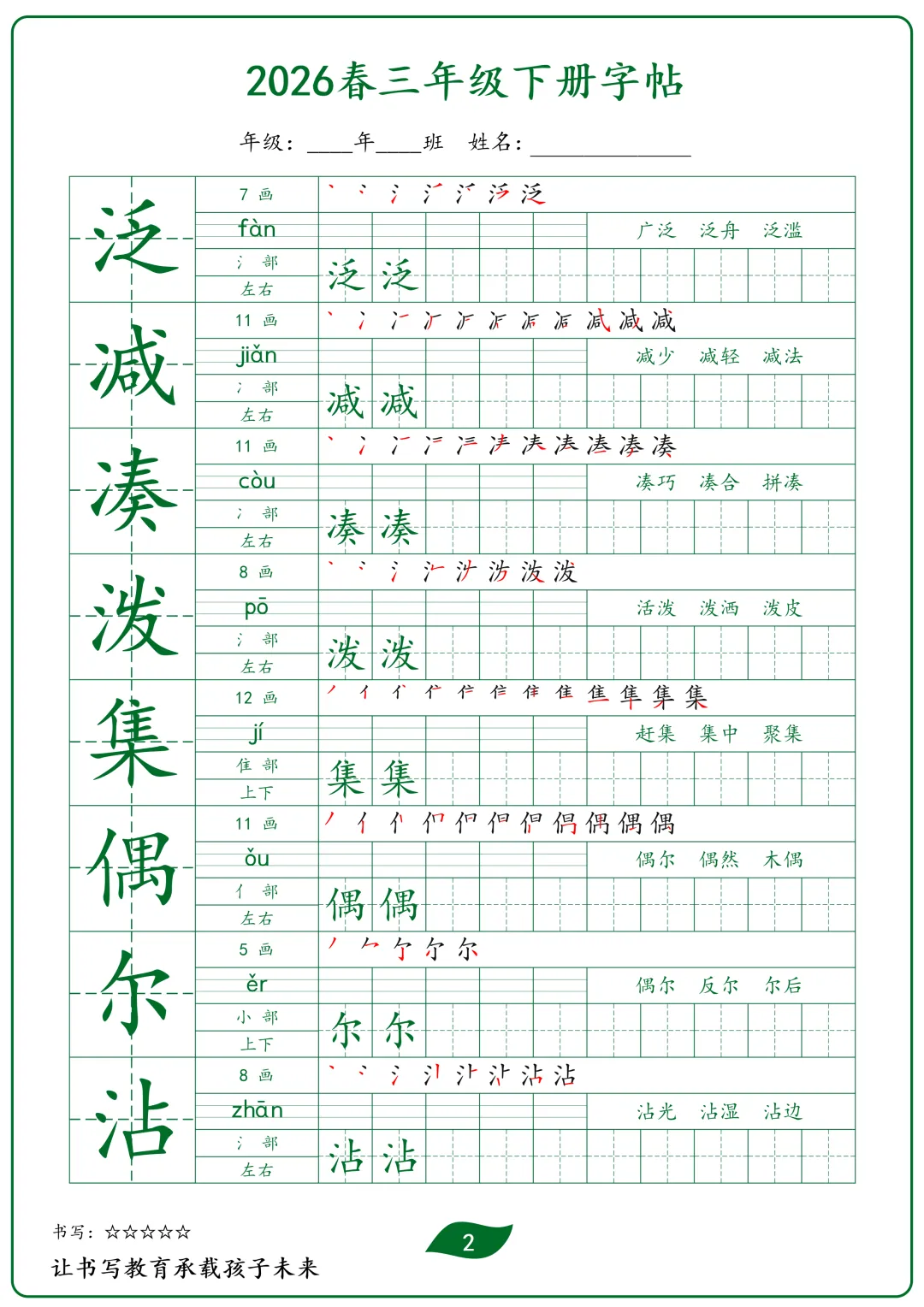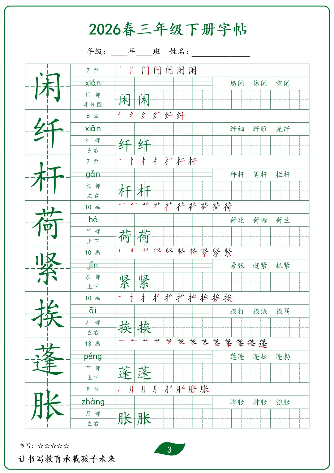 三年级下册语文生字字帖(护眼绿)(电子版可打印)