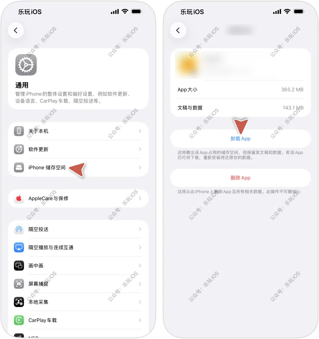 2、若需保留数据,可前往设置 > 通用 > iPhone存储空间,找到要降级的应用,选择「卸载」即可