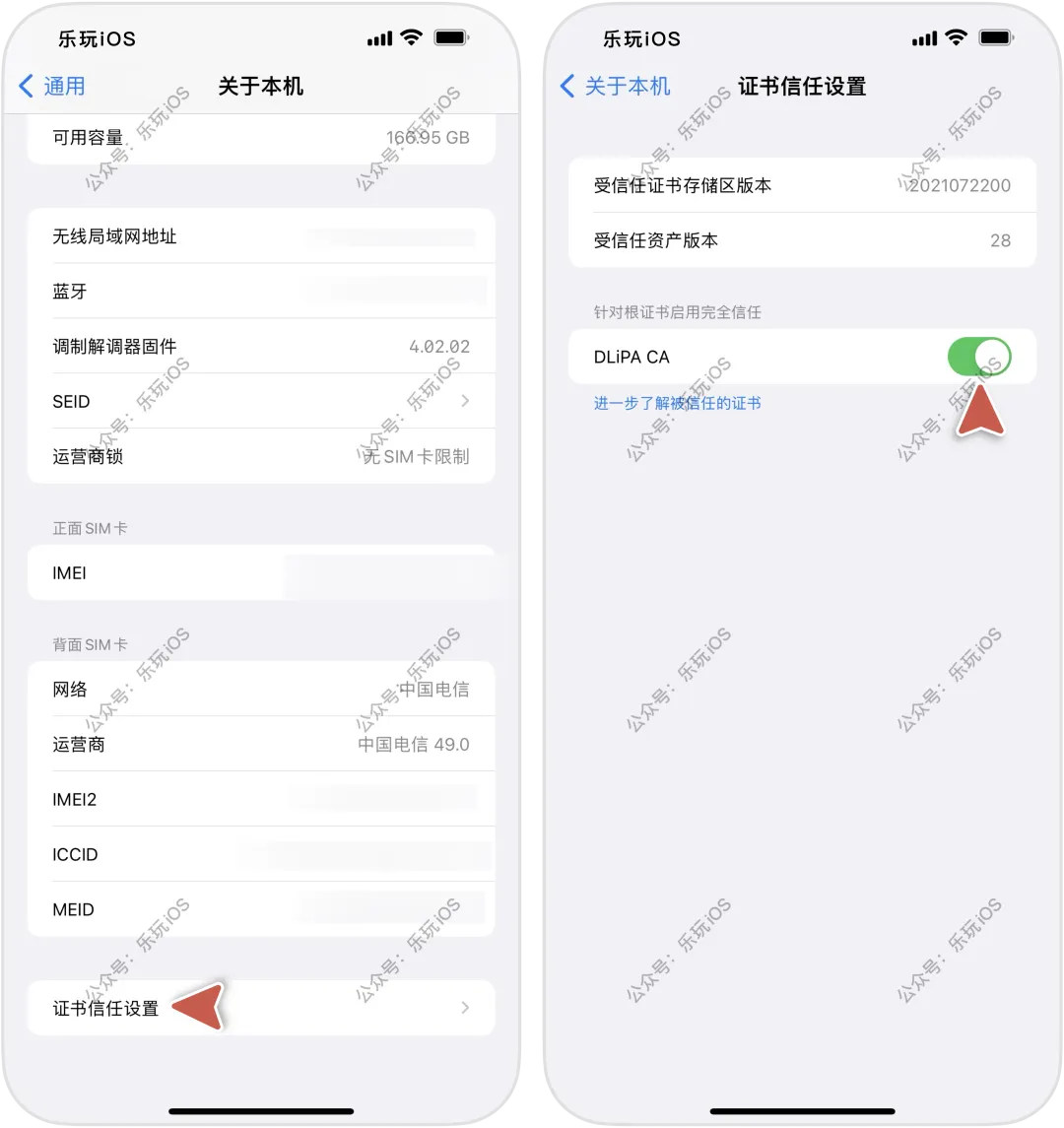 3、打开设置 > 通用 > 关于本机,下拉底部点击「证书信任设置」,打开DLiPA CA的按钮即可