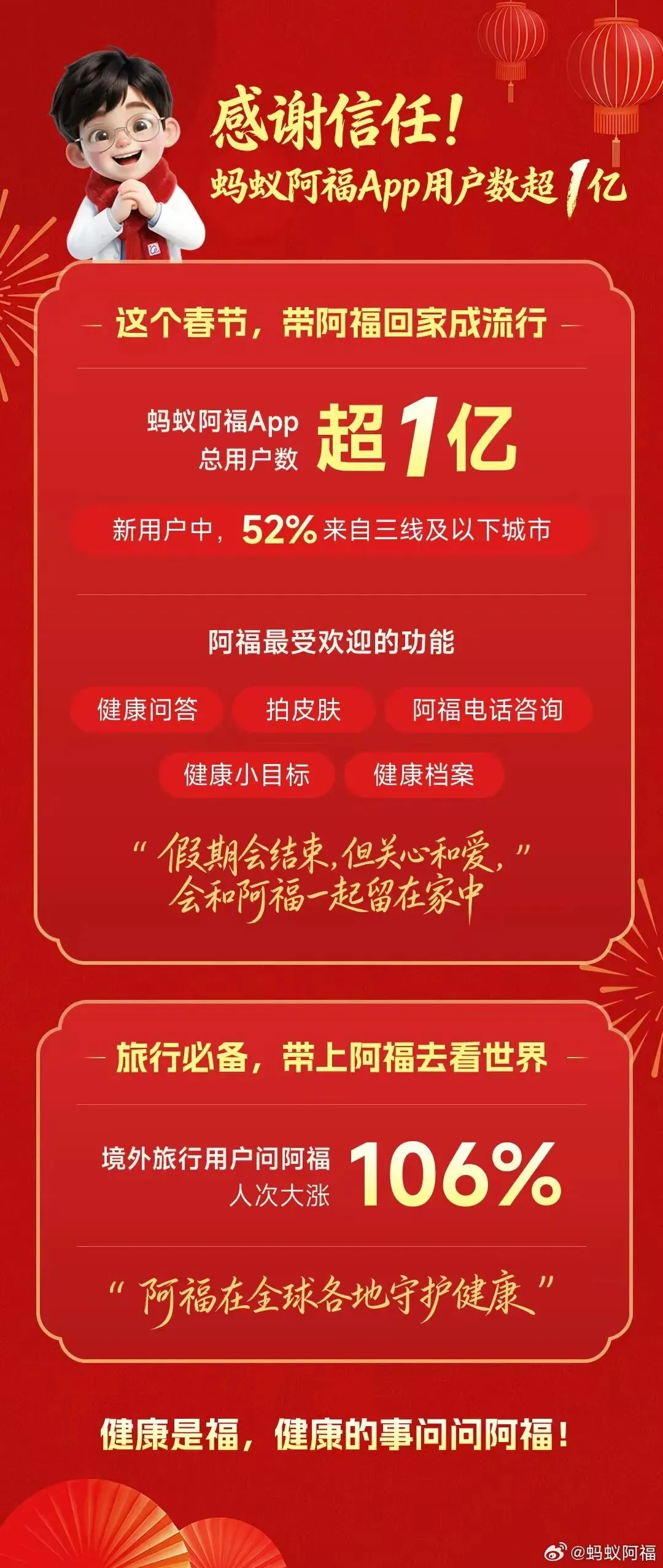 春节假期中,蚂蚁阿福App的用户数超1亿了!1 亿人信任的背后,是 1 亿份对健康的牵挂。
