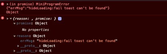 再补充几句,即便是按照上面的写法,哪怕是不加uni.showToast了,在微信小程序真机调试模式下(注意是真机调试,不是在微信开发工具上调试),控制台依然会报“hideLoading:fail toast can’t be found”,如图:
