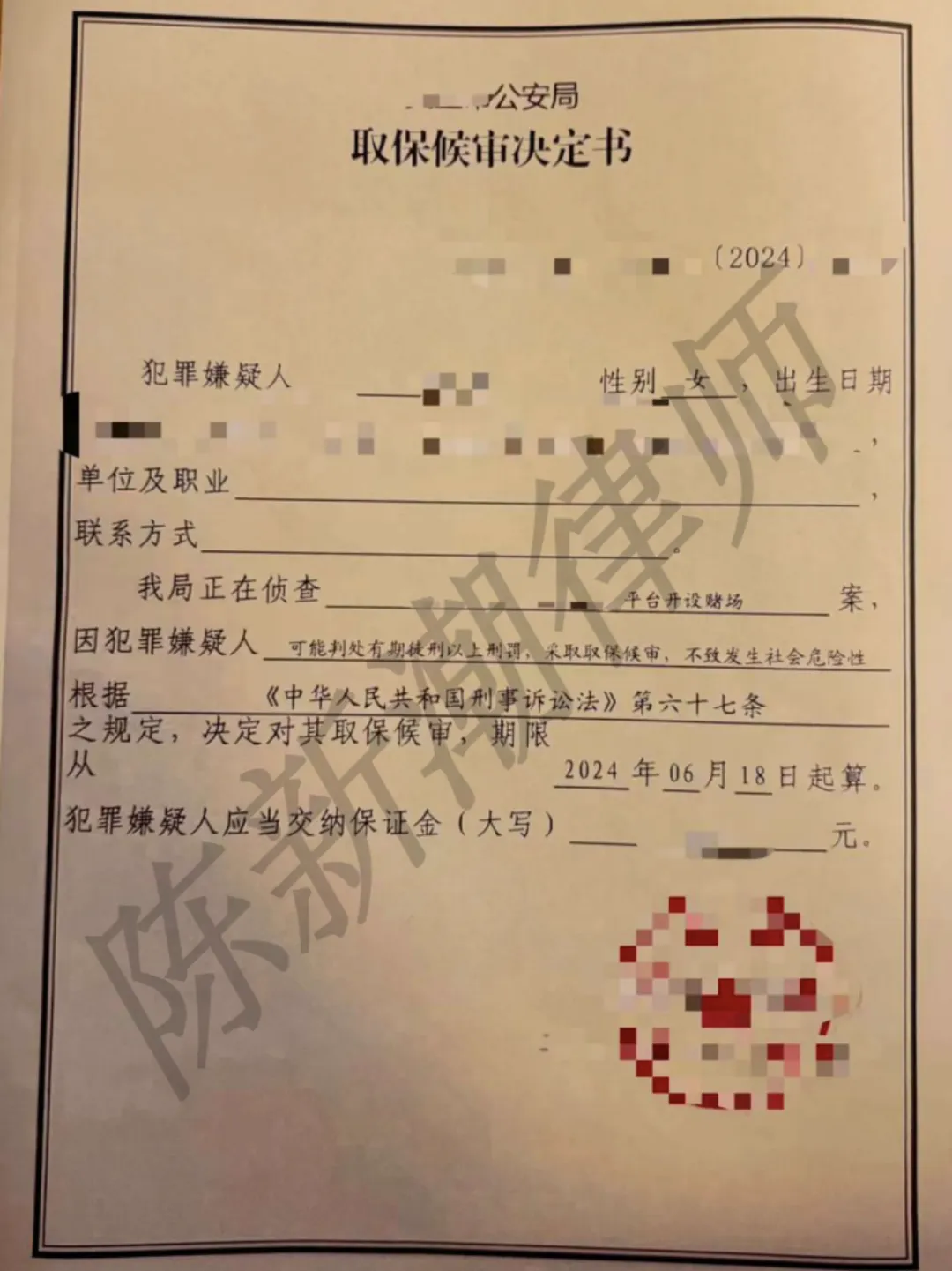 近日,陈律师承办的一起开设赌场案成功取保。