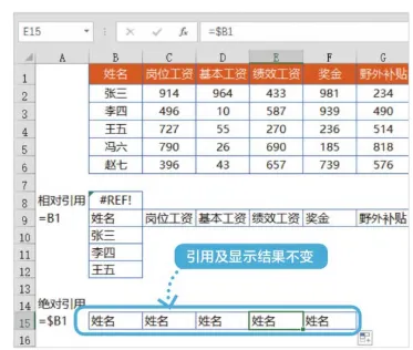 选择B15单元格,输入公式“=$B1”,按【Enter】键,然后横向向右填充,会看到单元格中的引用及显示结果都不发生变化。