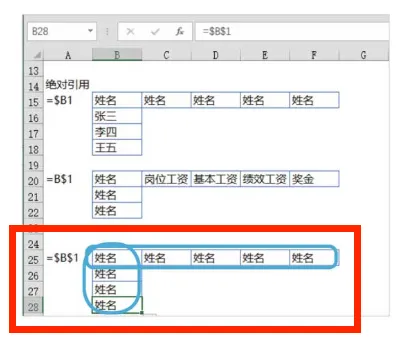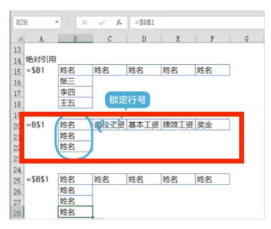 选择B25单元格,输入公式“=$B$1”,按【Enter】键。此时行号和列号之前都添加了“$”符号,然后横向向右填充或纵向向下填充,单元格中的引用及显示结果都不会发生变化。★