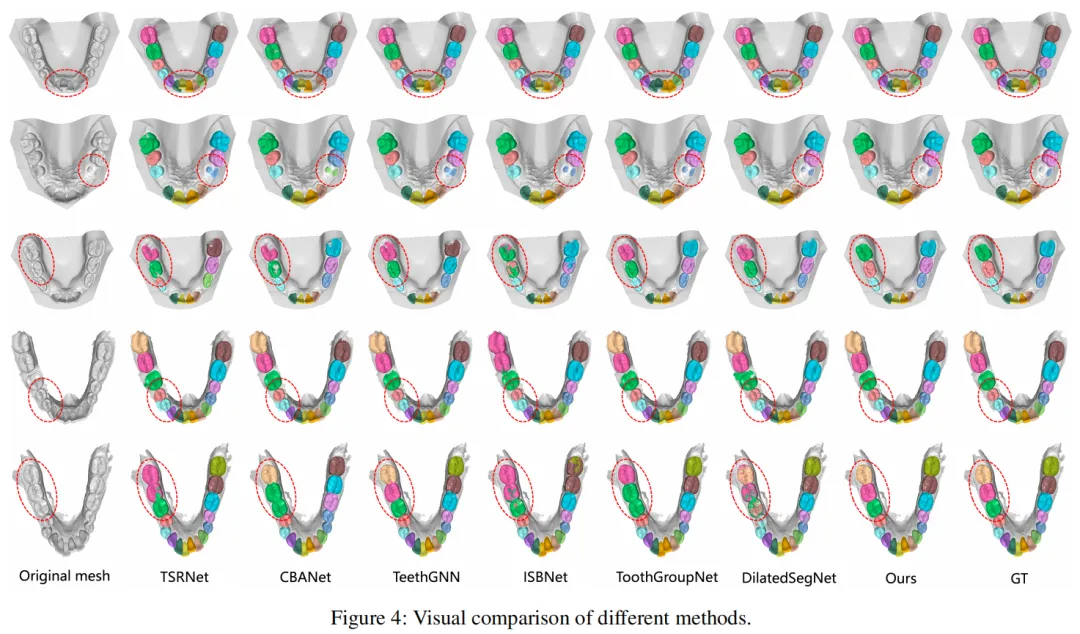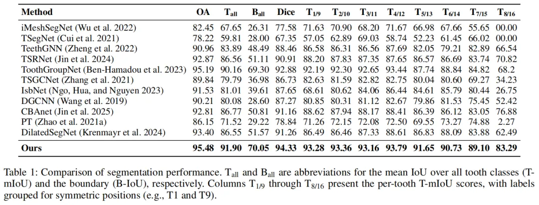整体准确率95.48%、牙齿级平均IoU 91.90%、边界IoU 70.05%、Dice分数94.33%,全指标第一; -