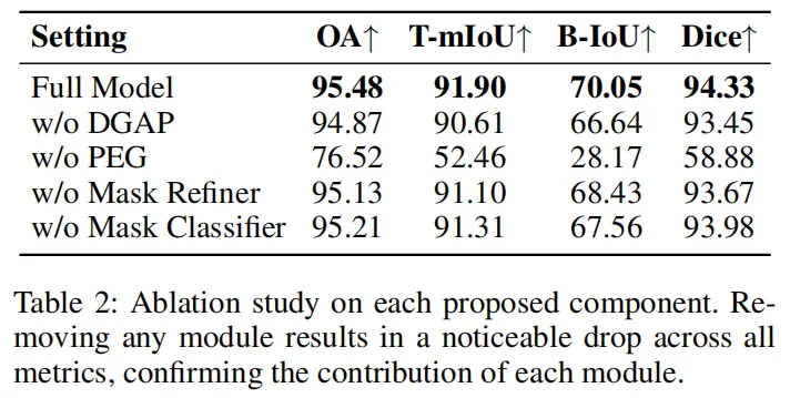 掩码细化器和分类器也都贡献了关键精度。尤其是边界和类别判断上。 放张消融实验结果图: