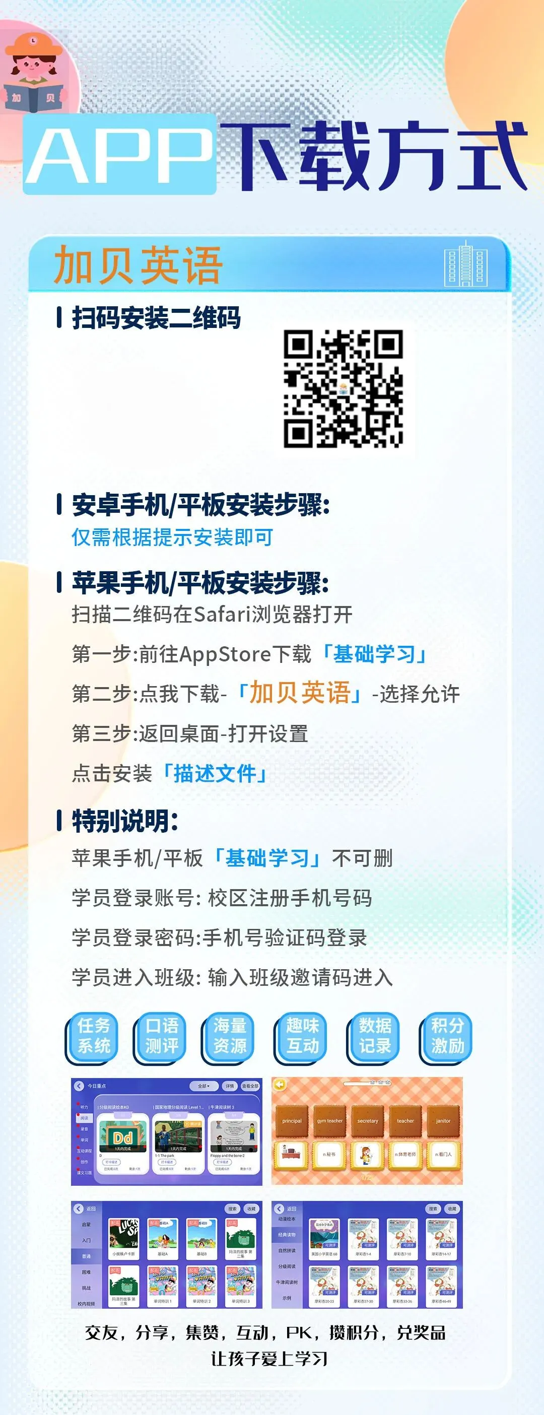 为了给孩子们提供一个更科学高效的学习路线,为了减轻大朋友的负担,加贝英语APP升级上线。不管是校内同步,还是新概念学习,原版探索(Power Up, Future Reading, RAZ, Think等)海量资源尽在其中,享受和一线城市一样的英语资源。
