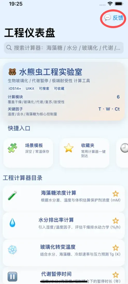 水熊虫能在极端环境中进入“隐生状态”:排出体内95%以上的水分,合成海藻糖,使细胞质玻璃化,代谢几乎停止。在这种“生物玻璃“状态下,它能承受宇宙真空、强辐射等极端条件,遇水后即可复苏。本工具基于这一机制,提供6个专业计算模块:海藻糖浓度计算:优化玻璃化保护剂配比水分排出率计算:评估干燥动力学玻璃化转变温度:预测临界转变点代谢暂停时间:估算隐生持续时间复苏时间预测:分解恢复各阶段极端环境耐受性:综合评估生存指数适用于常温保存、深空探测生命载体、生物制剂干燥技术等场景。让“隐生”从自然奇迹变为可计算的工程参数。