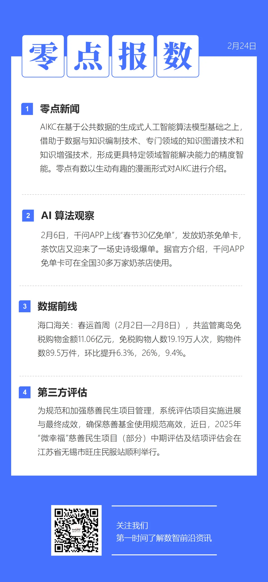 零点报数 | 千问APP上线“春节30亿免单”;春运首周,共监管离岛免税购物金额11.06亿元 零点有数 · Dataway 北京零点有数数据科技股份有限公司(深交所上市,简称:零点有数,股票代码:301169)是中国前沿的数据分析与决策智能服务机构。深耕公共事务和商业服务的诸多领域,以第三方评估为驱动、以解决应用场景中的关键问题为出发点,梳理和优化不同垂直行业的模型与算法。在数据智能时代,公司不断整合移动互联网、人工智能、云计算、物联网等领域新技术,将多源数据与公共和商业服务的垂直行业场景结合,将30多年积累的专业知识实现“经验模型化,模型算法化,算法软件化”,推进决策科学化、服务高效化。 口号 算法绽放,相信数据智能的力量! 愿景 建设数据分析与决策智能业的中国典范 使命 用专业分析的能量,助力领导者决策更有数 价值观 先锋主义、专业主义、长期主义 团队文化 富于洞见、乐于协力、追求卓越的知识服务战队 官网 www.idataway.com 电话 010-53896000 邮箱 mkt@idataway.com 商务合作请点击左下角【阅读原文】
