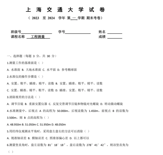上海交通大学工程测量期末试题,可打印 获取更多考研资料可加小编QQ:3542263029或者v信kyzlfx 先点“赞+在看”联系客服即可免费赠送公共课(政治英语数学)资料 其他院校陆续更新中…….有需要联系客服留言即可 更多真题资料会第一时间为大家推送 还有其他年份,可联系客服详询 01 部分截图如下🔥 温馨服务 免责申明:资料整理于网络如有侵权请告知删除 长按并识别下方二维码关注公众号,不定时发放考研福利哦 扫一扫添加微信好友,获取更多考研信息哦~