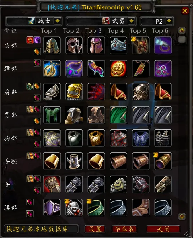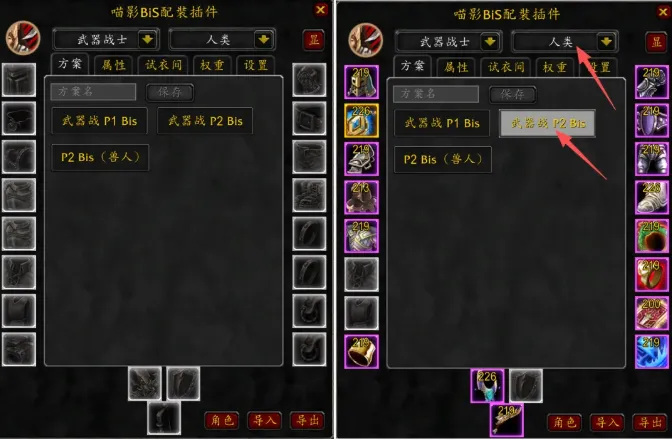 这款插件最大的优点就是操作门槛低到离谱,下载安装完成之后你不需要做任何复杂设置,直接打开插件界面选择自己的职业天赋以及种族,对应阶段的毕业装备清单立马就弹出来了。