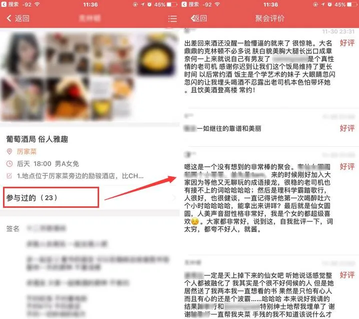 参与过的约会可以让你判断出这个用户是不是小号和经常出没的餐厅,约会评价可以让你客观的从别人的描述中分析出这个人的为人。