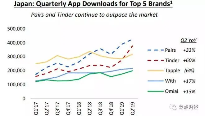 除了Tinder以外,Match Group在2015年收购的Pairs正在成为最受日本年轻人欢迎的约会软件,根据APP Annie的数据,Pairs和Tinder在第二季度成为日本下载量最多的约会软件,下载量分别同比增长33%和60%,而第三名的Tapple在竞争中逐渐落后,下载量同比下跌6%。