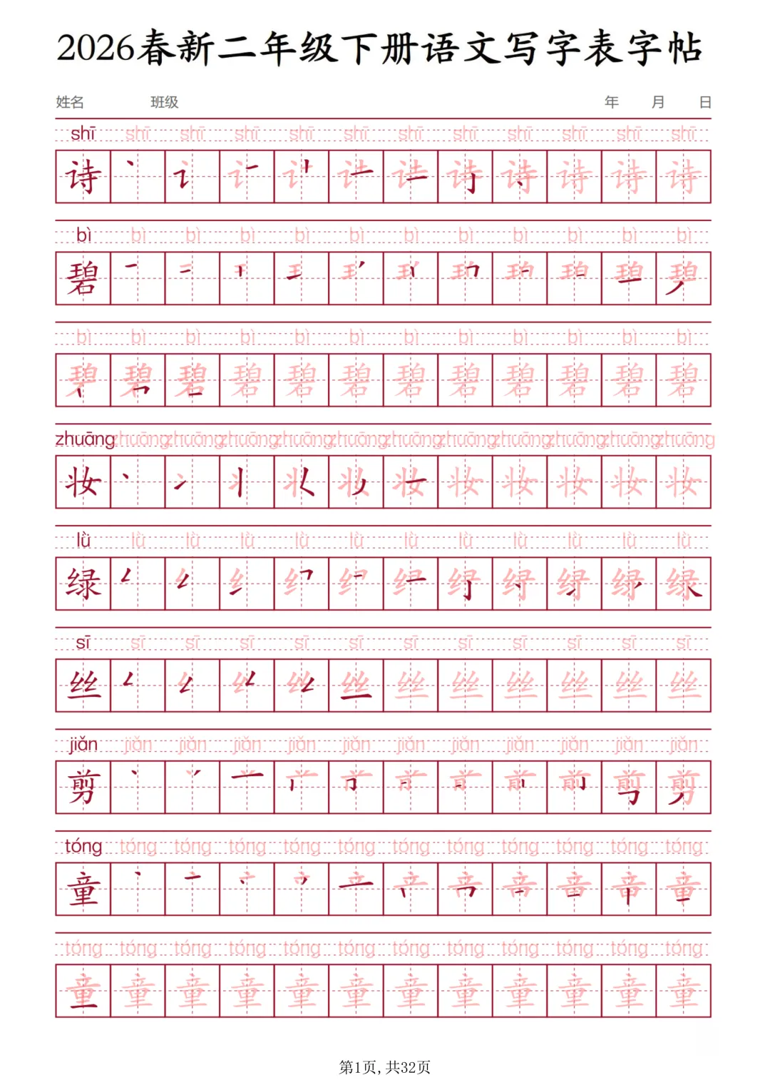 今天为大家分享:寒假是小学语文学习 “弯道超车” 的黄金期,尤其是对于二年级学生而言,这一阶段正是识字量快速积累、书写习惯定型的关键节点。二年级下册语文的写字表,收录了课文核心生字,既是课内学习的重点,也是规范书写的核心内容。一套贴合教材的字帖,能让孩子在临摹中吃透笔画顺序、间架结构,为新学期的语文学习筑牢根基。