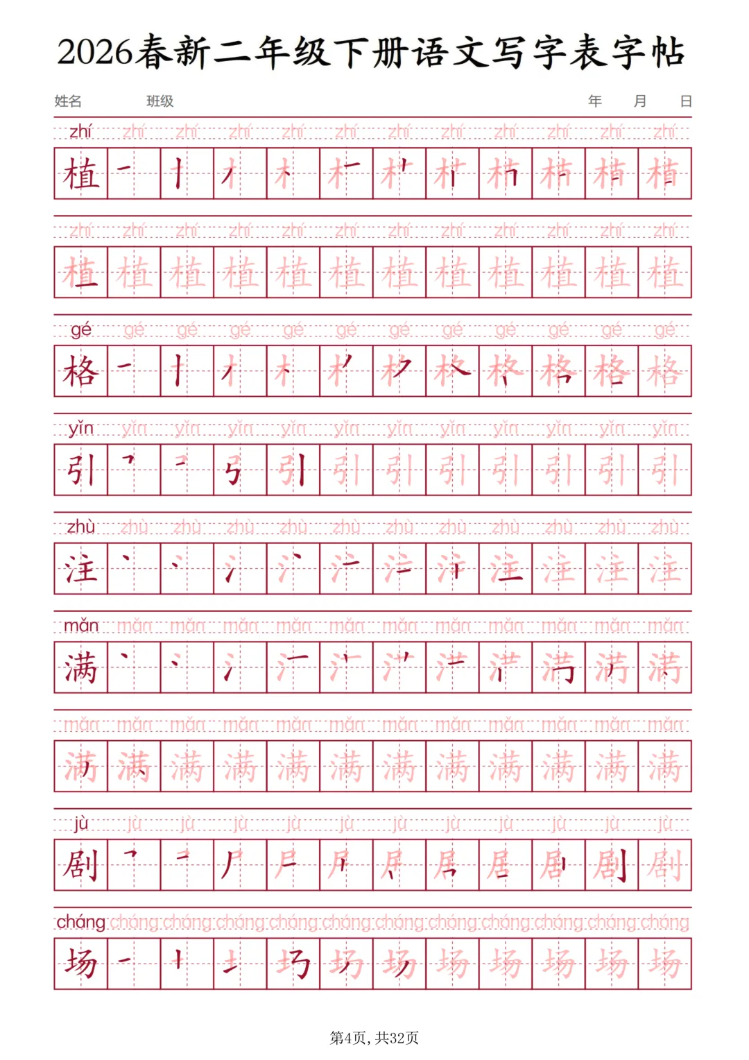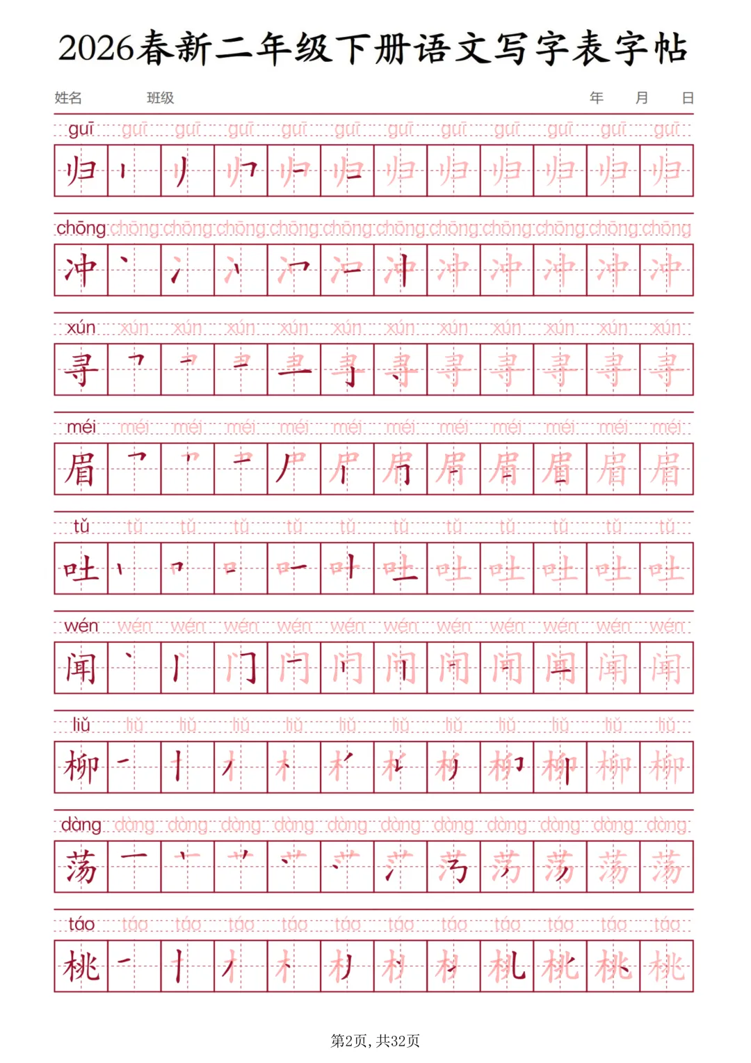 二年级下册语文写字表字帖(电子版可打印)