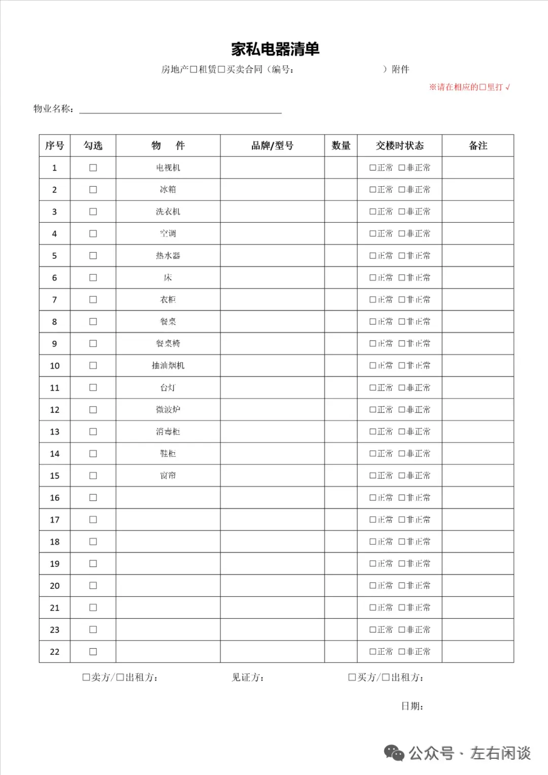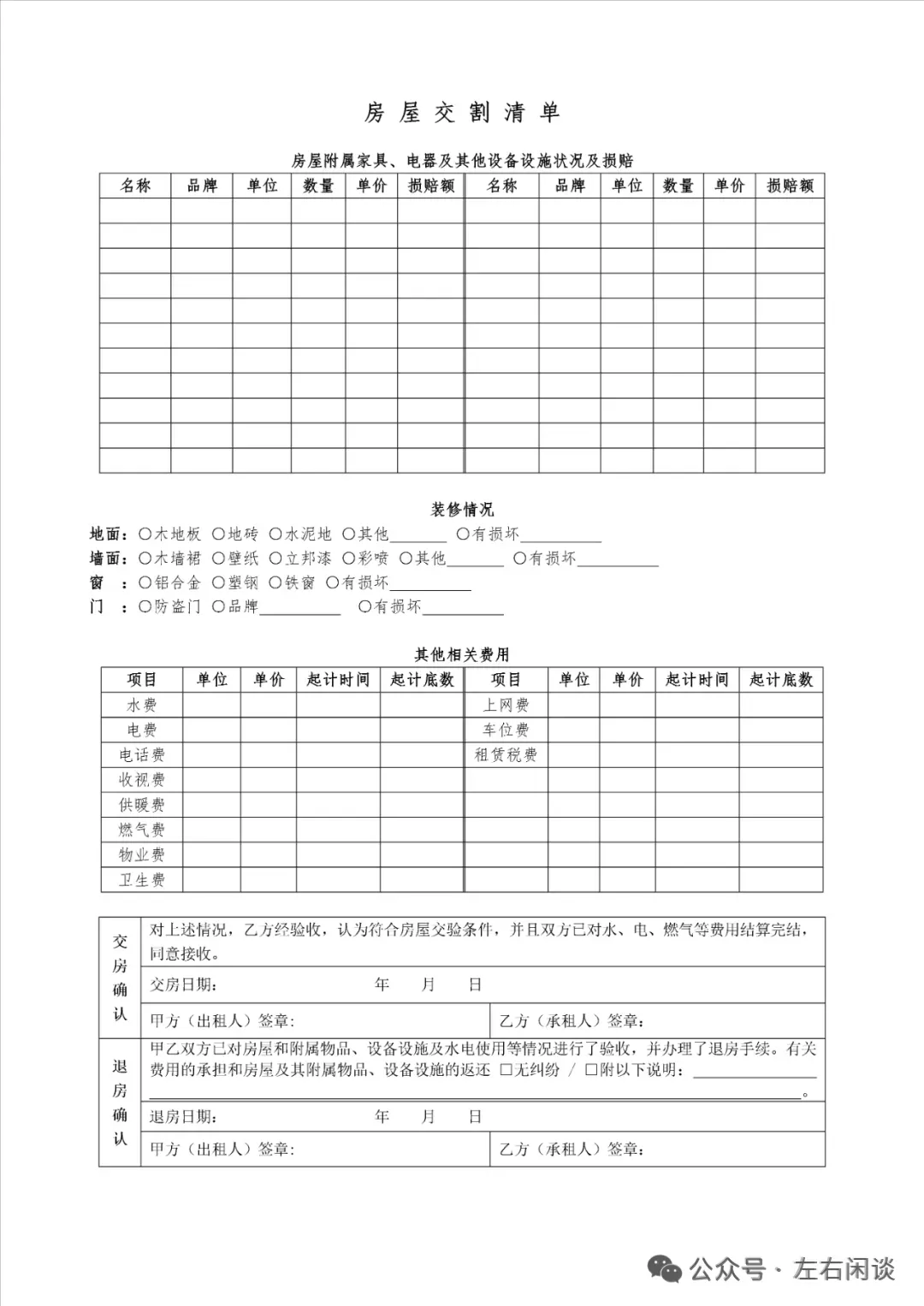房屋租赁交割清单
