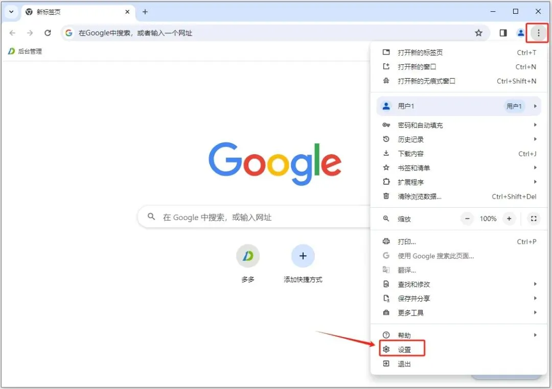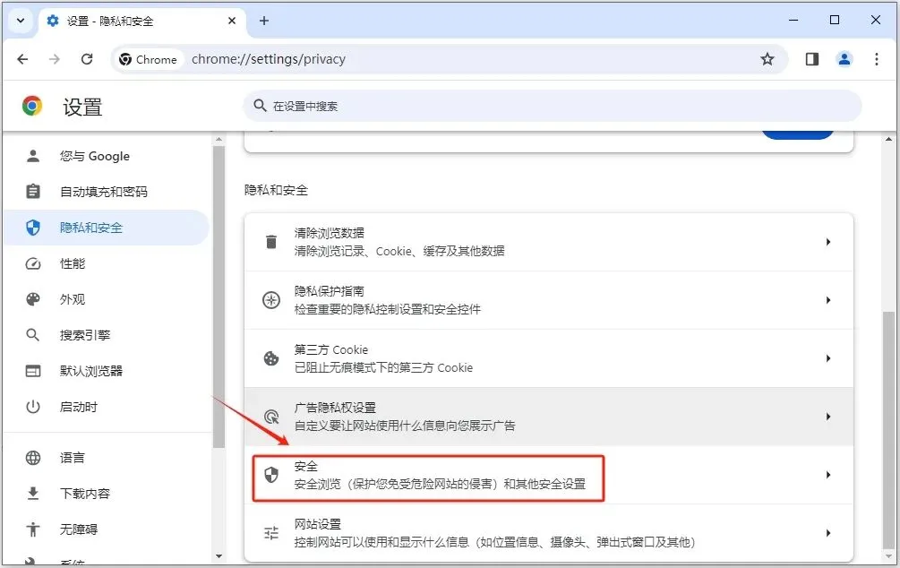 1、双击打开电脑版谷歌浏览器进入主页面,在右上方点击如图所示的三个点图标,点击“设置”,然后点击切换到“隐私和安全”,在右侧点击“安全”;