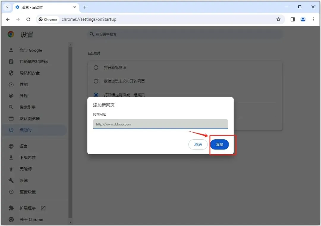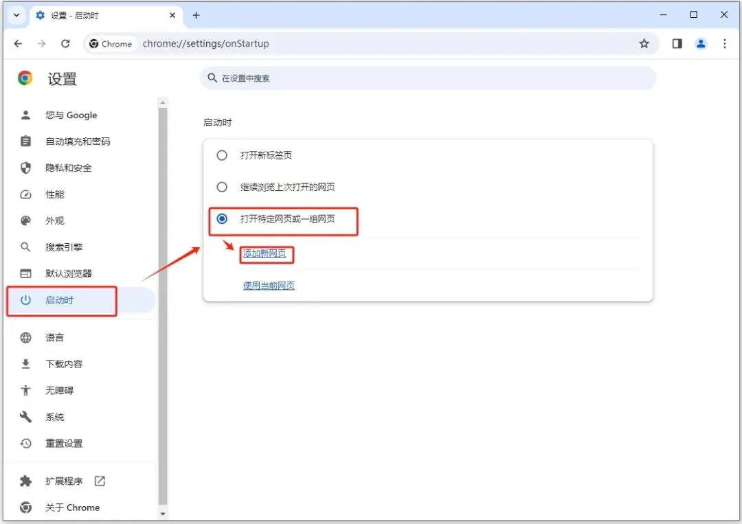 2、在设置页面点击“启动时”——“打开特定网页或者一组网页”——“添加新网页”;