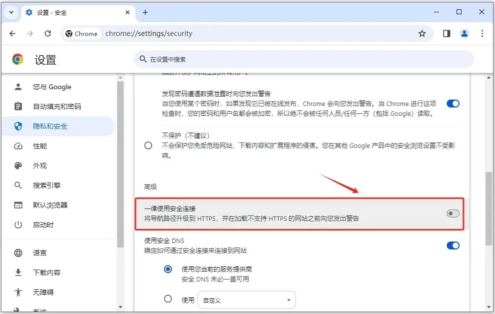 2、然后点击“一律使用安全连接”右侧的按钮开启就可以了;