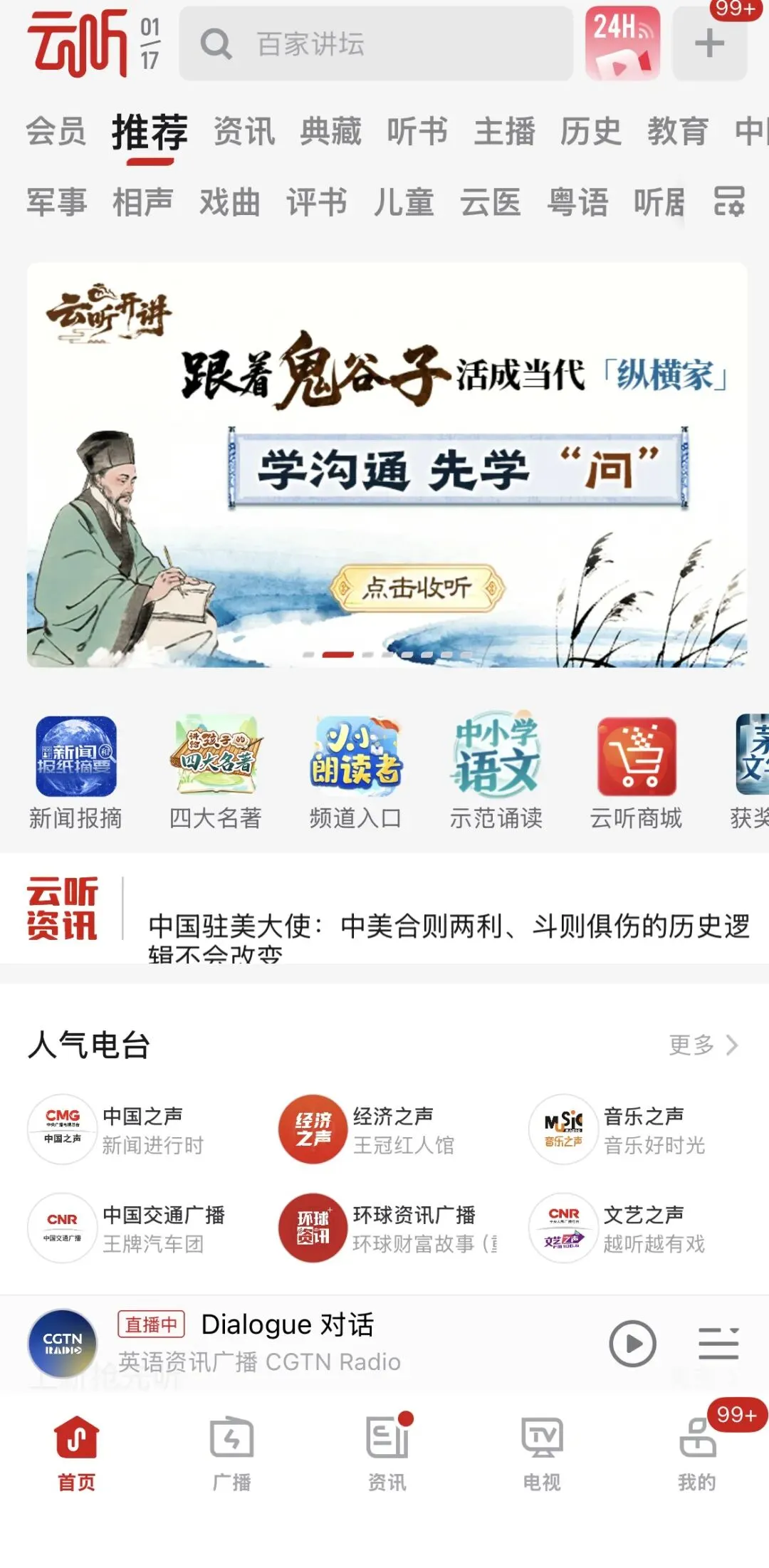 中央广播电视总台旗下央广云听文化传媒有限公司开发的官方音频客户端,提供广播直播、电视节目音频、有声书及资讯服务,支持多终端适配。包括文学、经济、英语等内容非常全面,也包括非常适合孩子的故事大王、百科全书、国学启蒙,还有中小学课本同步读等内容。