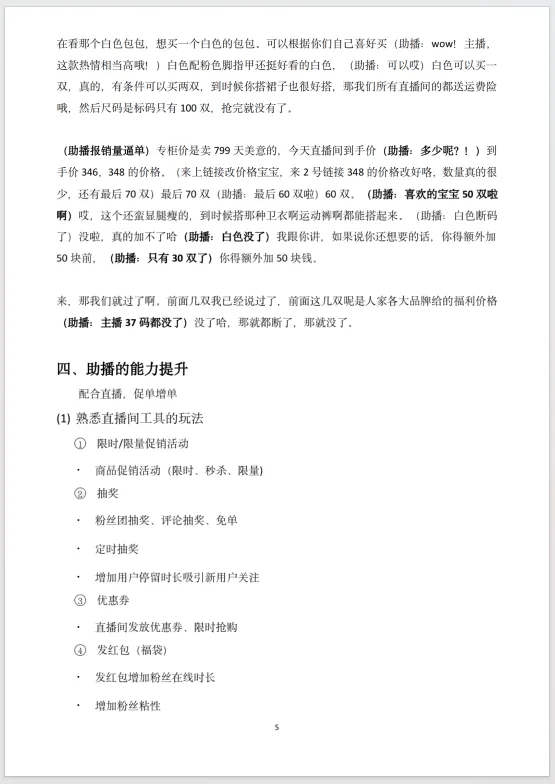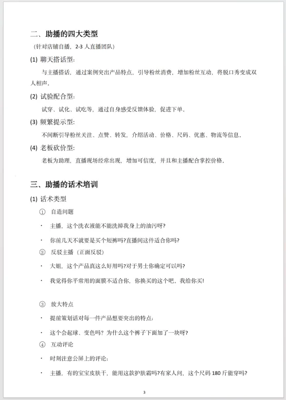 该《直播带货助播岗位工作流程》文档系统阐述了小型直播团队中助播岗位的工作体系,涵盖职责、类型、话术、能力、薪酬与考核六大方面。助播的核心职责包括前期准备、控制屏幕、气氛烘托、现场应对及配合主播,涉及样品与道具准备、直播节奏与评论管理、互动促单、突发处理等具体任务。根据团队需求,助播可分为聊天搭话型、试验配合型、频繁提示型和老板砍价型四种类型。话术培训重点在于通过自造问题、正面反驳、放大产品特点及互动评论等技巧,配合主播完成讲品、互动、憋单和逼单全流程,案例展示了如何分三段(铺垫、试穿互动、促单)在约3分30秒内完成销售闭环。能力提升强调熟悉直播间促销工具(如限时活动、抽奖、优惠券、红包)并掌握砍价、营造紧张氛围、联络商家、增强信任等实战技能。薪酬方案采用提成制,助播提成比例为净销售额的0.5%,通常隔月结算。考核体系围绕业务、态度、行政、专业技能及沟通协调五个维度展开,设置具体评分标准,例如业务操作零出错、产品知识清晰、沟通零投诉等,同时提供了纵向晋升(如从运营助理至直播运营总监)与横向发展(转向活动运营、用户运营或主播)的职业路径建议。整体而言,文档为小型直播团队构建了助播的标准化工作框架与成长路径。