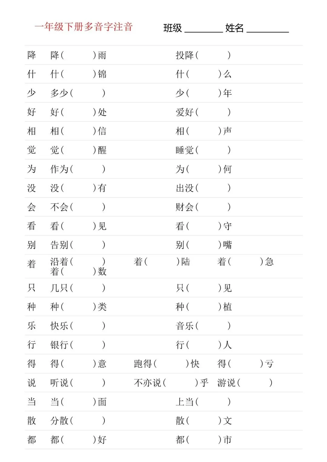 大家好,今天刘老师给大家整理了《一年级下册多音字专项训练》。各位家长或者老师可以下载下来,打印给孩子!【建议老师转发到班级群】