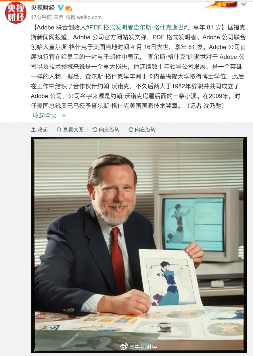 央视财经4月18日消息,据福克斯新闻网报道,Adobe公司官方网站发文称,PDF 格式发明者、Adobe 公司联合创始人查尔斯·格什克于美国当地时间4月16日去世,享年81岁。他此前生活在美国旧金山 Los Altos 郊区,消息是 Adobe 公司官方发布的。