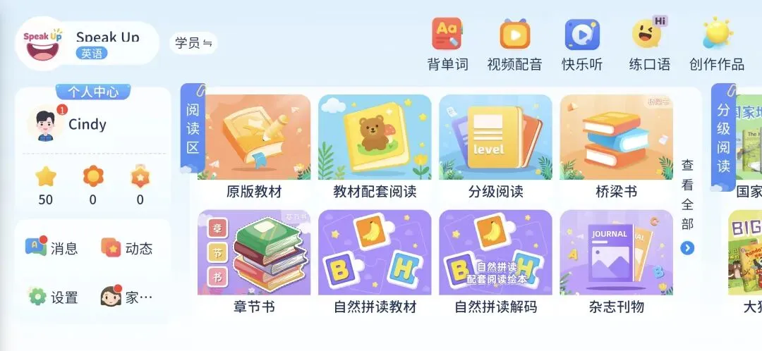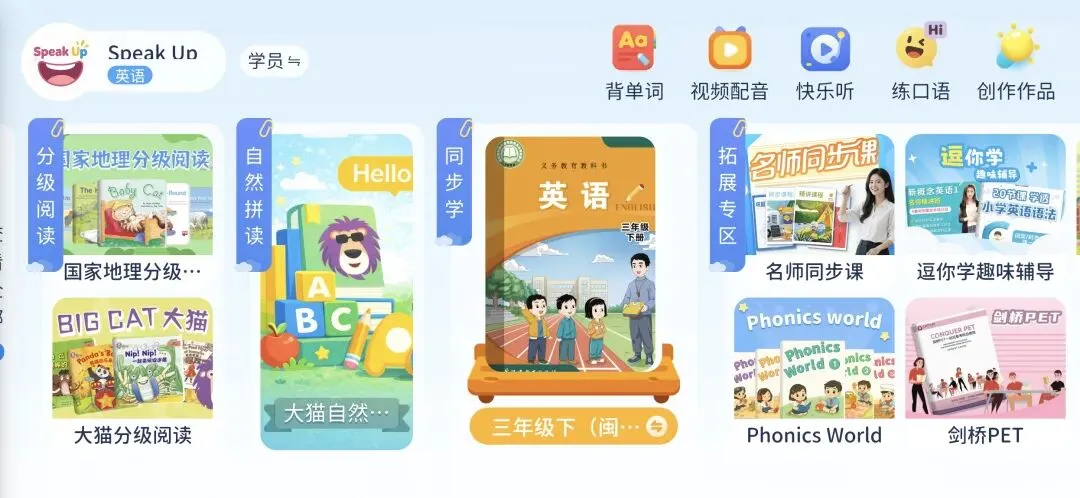App里面资源丰富、绘本,分级阅读,儿歌视频,单词闯关,真人对话练习配音,考试习题测试,还有市面最火的主线教材部都有…..还有真人配对对话互动口语练习。