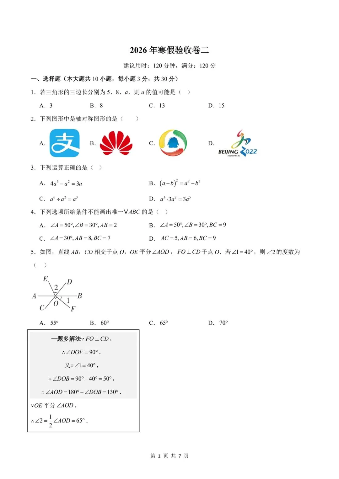 2026年春北师大版初一七年级下册数学《开学摸底检测卷,寒假验收卷》(含答案解析,共2套)-高清电子版可打印