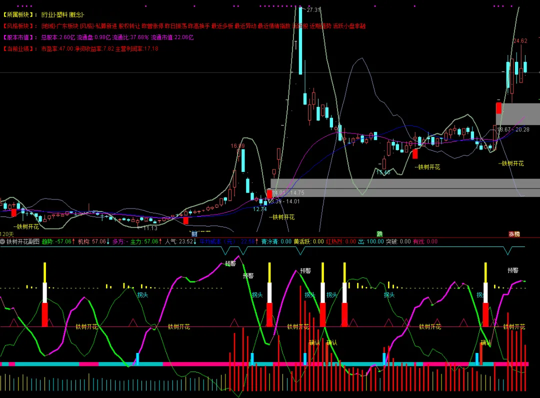 M2均线位置的90.9%处,显示黄色的“--铁树开花”字样。 -