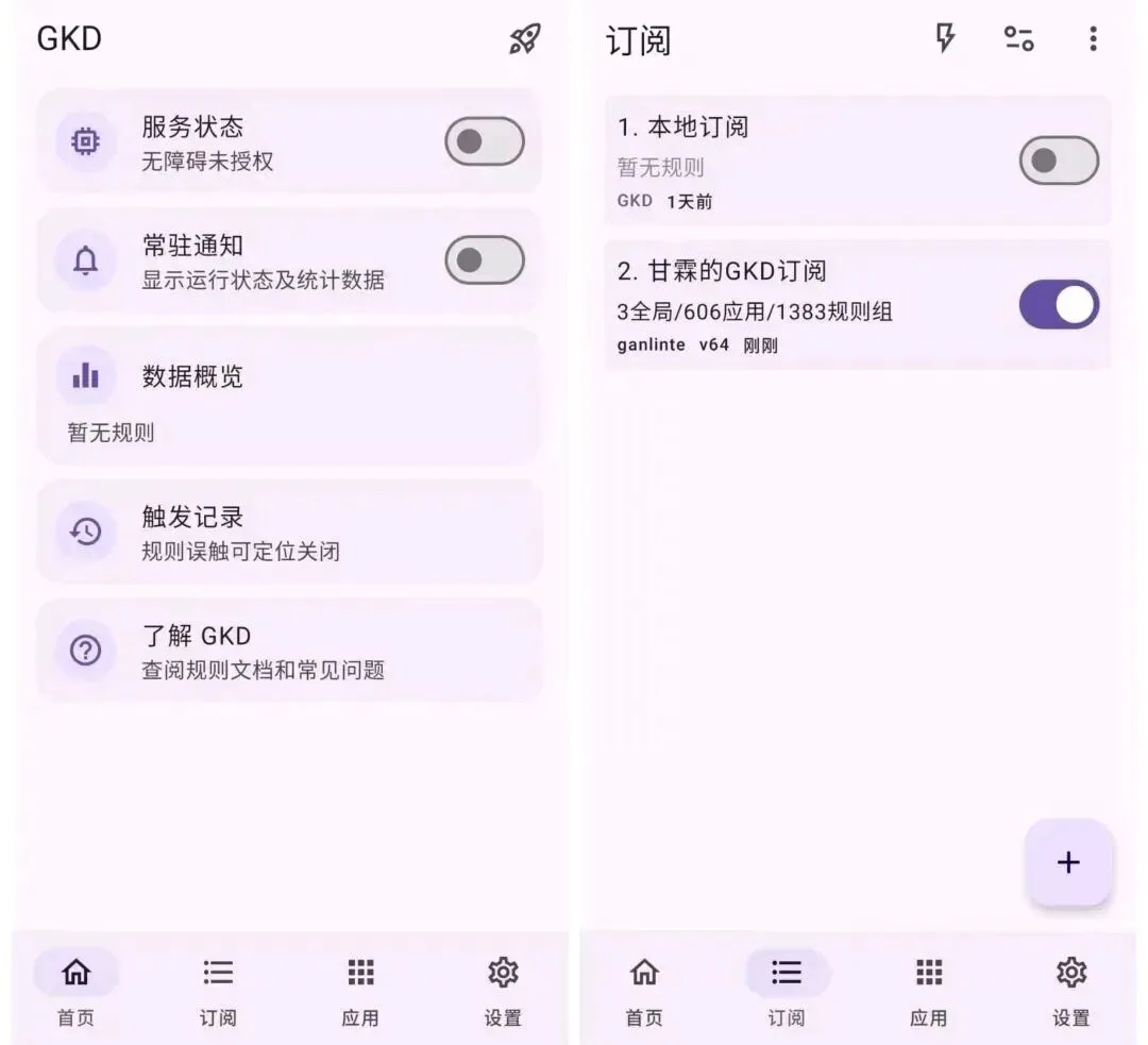 在首次使用时,需授予软件“无障碍权限”。完成授权后,进入【订阅】界面,点击右下角的“+”号以添加订阅。设置完毕后,返回桌面,打开目标应用。当应用出现开屏广告或符合相应规则时,软件将自动跳过。