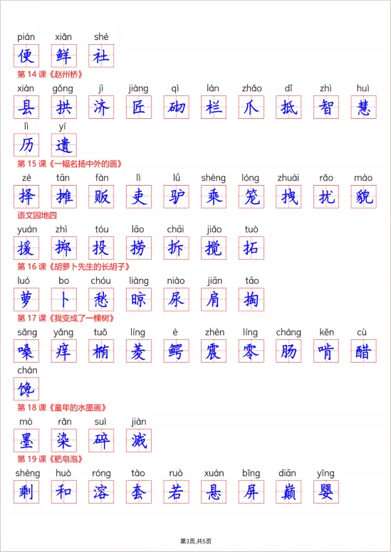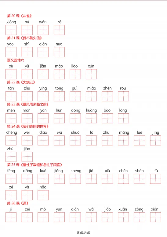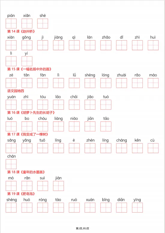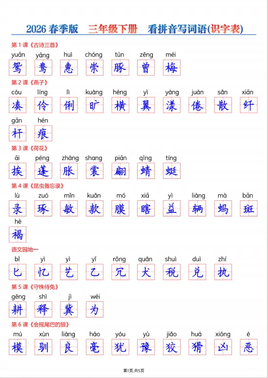 2026春季版三年级下册人教版语文《看拼音写词语》(识字表),有答案,共10页,电子版可下载打印。完全同步三年级下册识字表,一课一练,把会认、会读、会写的字词全部练到位。看拼音写词语,既能复习拼音,又能强化生字字形、笔顺、组词,避免提笔忘字。专门练易错字、形近字、同音字,帮孩子减少考试里最容易丢分的错别字。