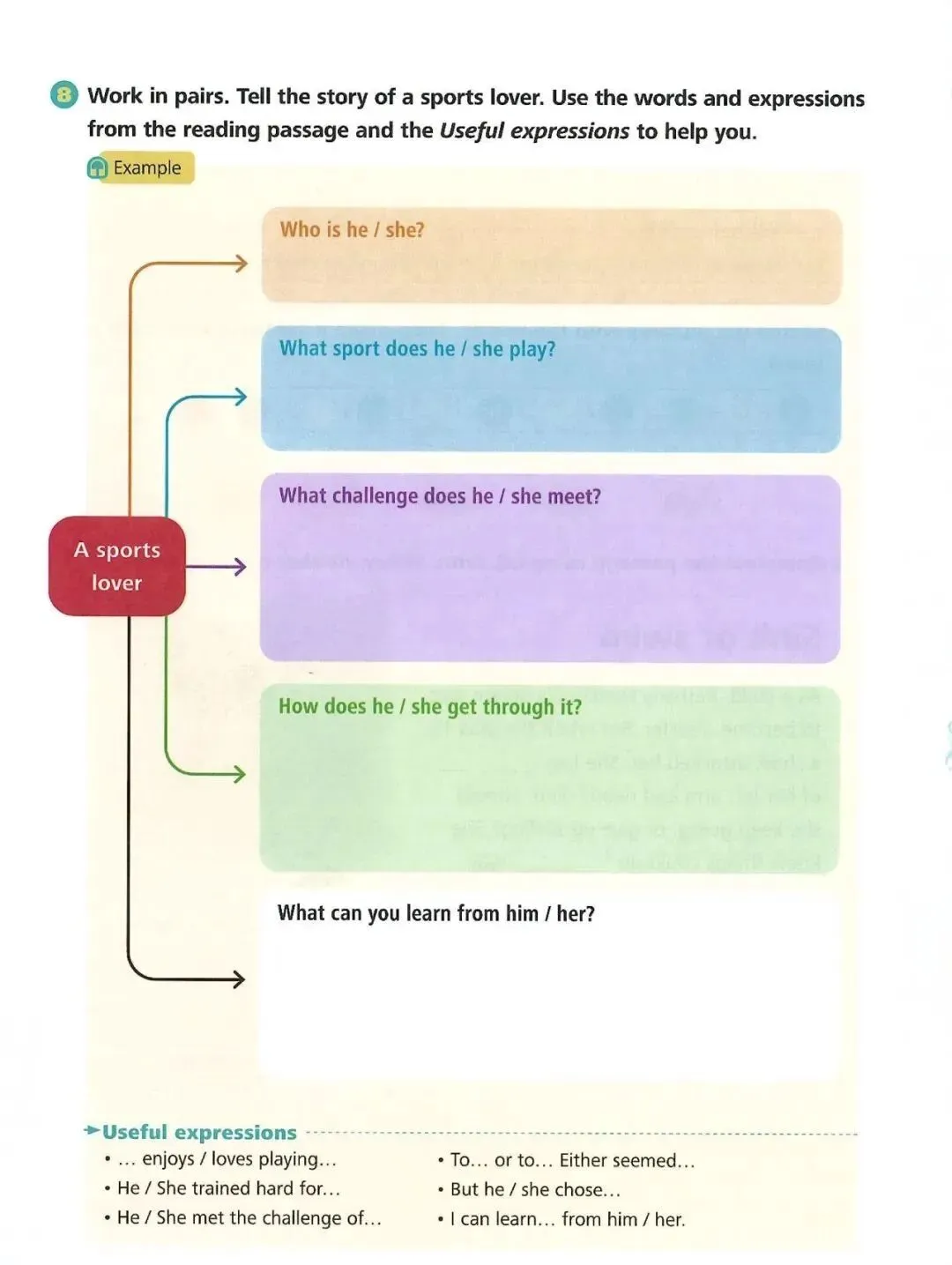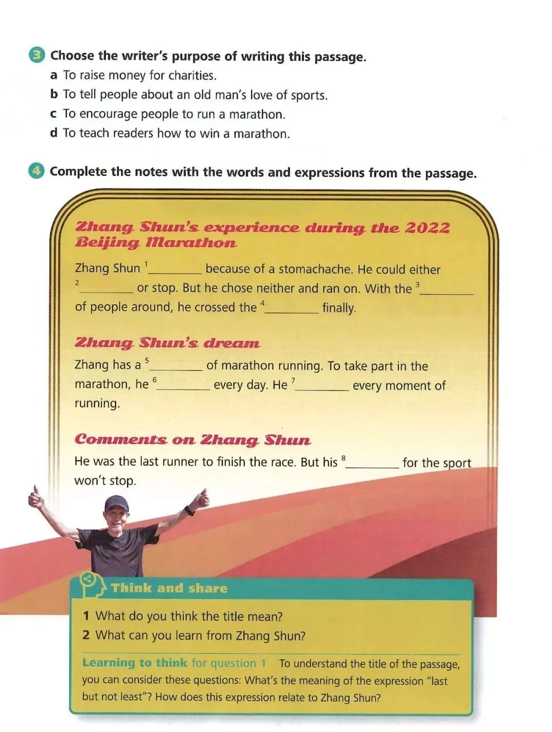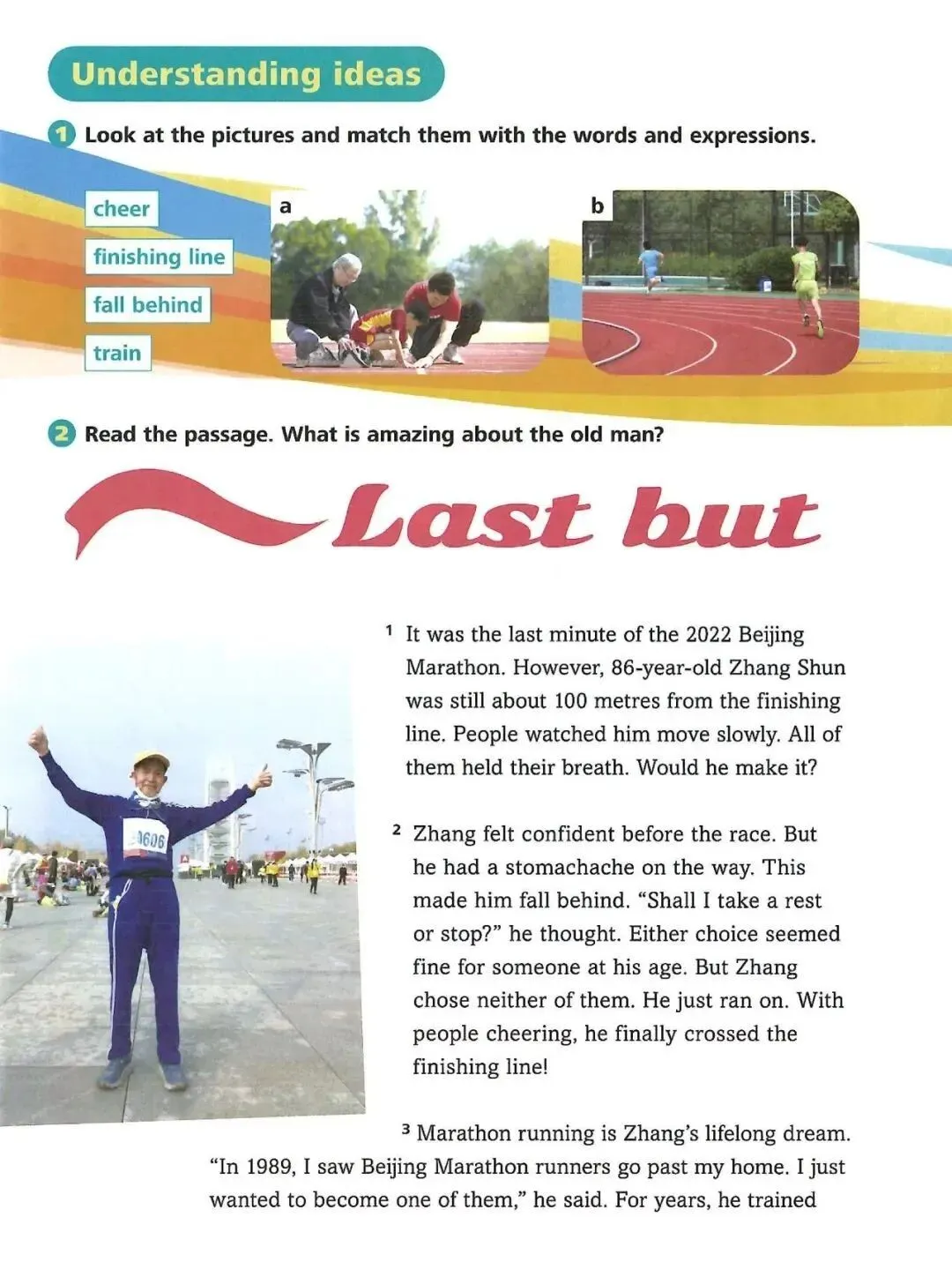 Zhang felt confident before the race. But he had a stomachache on the way. This made him fall behind. “Shall I take a rest or stop?” he thought. Either choice seemed fine for someone at his age. But Zhang chose neither of them. He just ran on. With people cheering, he finally crossed the finishing line!