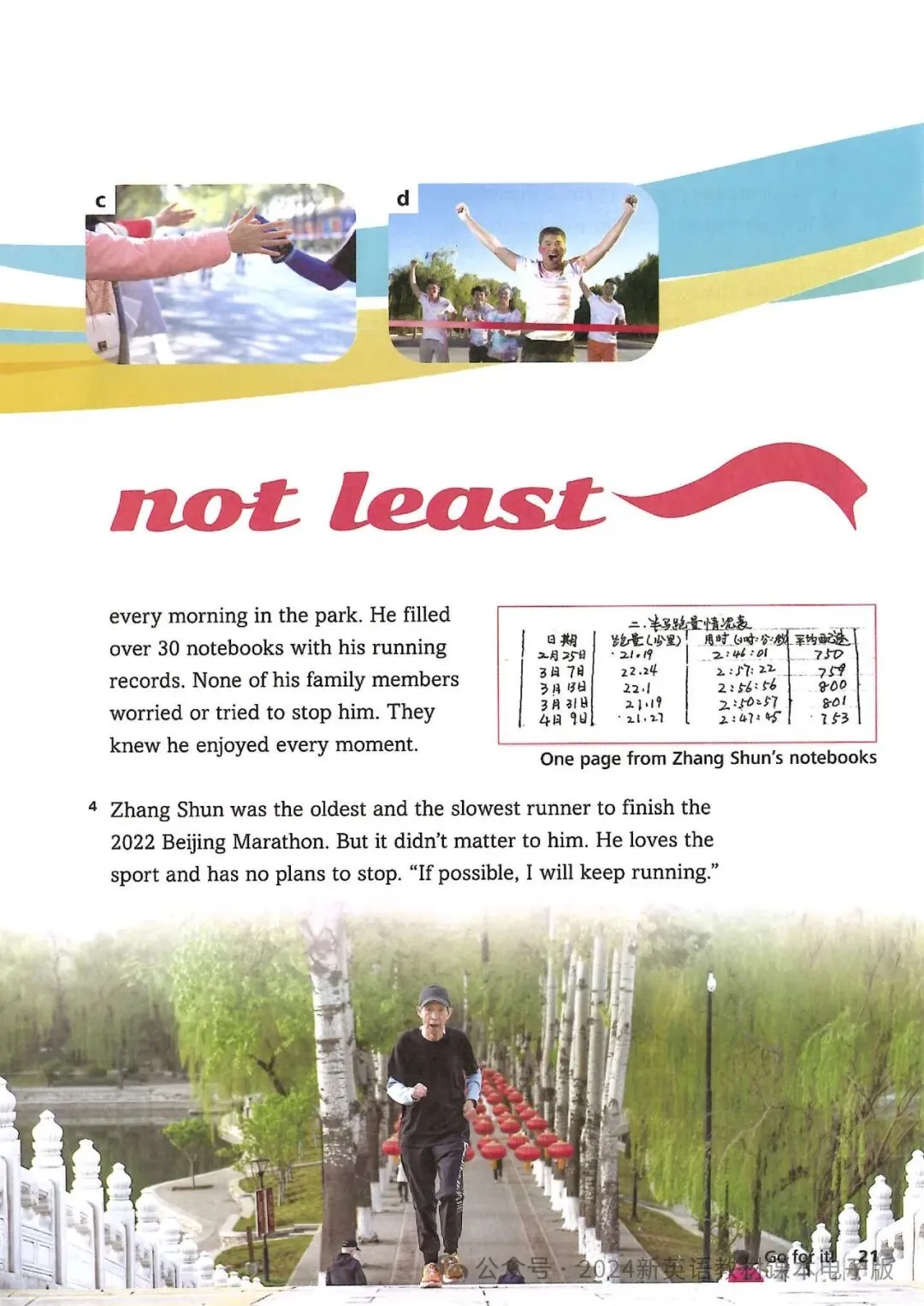 Marathon running is Zhang’s lifelong dream. “In 1989, I saw Beijing Marathon runners go past my home. I just wanted to become one of them,” he said. For years, he trained every morning in the park. He filled over 30 notebooks with his running records. None of his family members worried or tried to stop him. They knew he enjoyed every moment.马拉松跑步是张顺毕生的梦想。“1989年,我看到北京马拉松选手经过我家。我就想成为他们中的一员,”他说。多年来,他每天早上都在公园里训练。他用30多本笔记本记录了他的跑步记录。他的家人没有一个担心或试图阻止他。他们知道他享受每一刻。