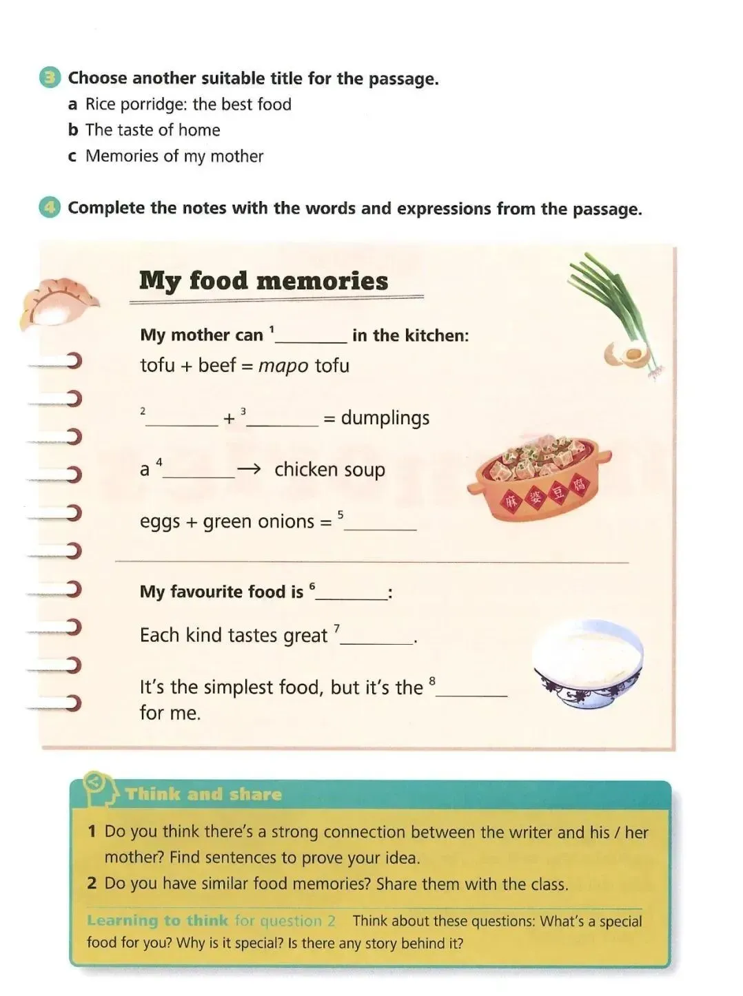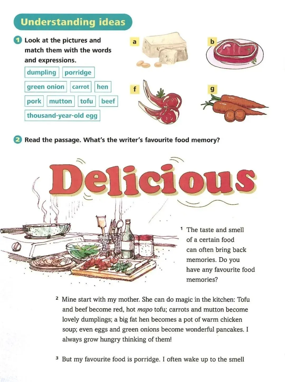 But my favourite food is porridge. I often wake up to the smell of porridge. Sometimes, it’s sweet eight-treasure porridge. Other times, it’s porridge with pork and thousand-year-old eggs. Each kind of porridge tastes great in its own way. When I fall ill, my mother always makes plain rice porridge for me. That’s the simplest food on any Chinese menu. For me, however, it’s the best food in the world. And it’s better medicine than a pill!