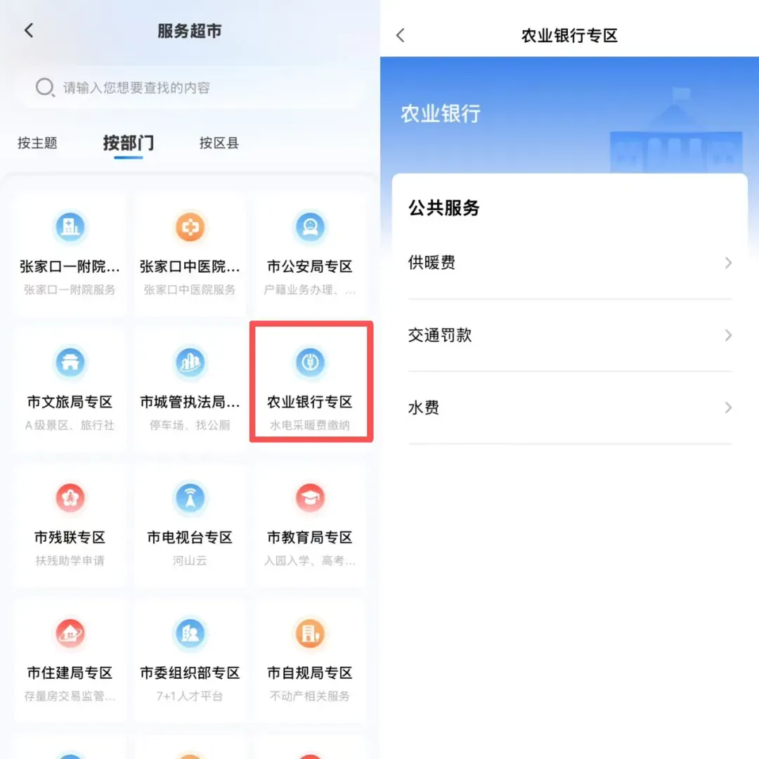 打开“幸福张家口”App → 进入首页【服务超市】→ 选择【按部门查找】 → 点击【农业银行专区】。根据需求选择【供暖费】、【交通罚款】或【水费】,输入户号确认金额后,按提示完成支付即可。