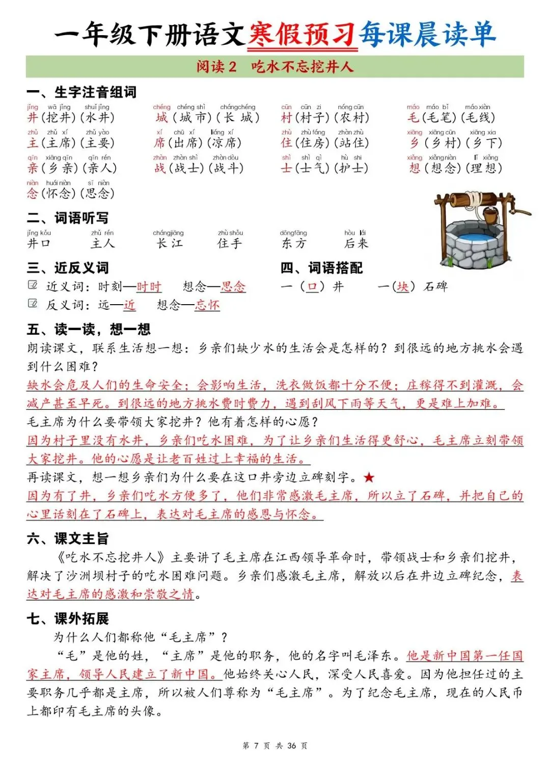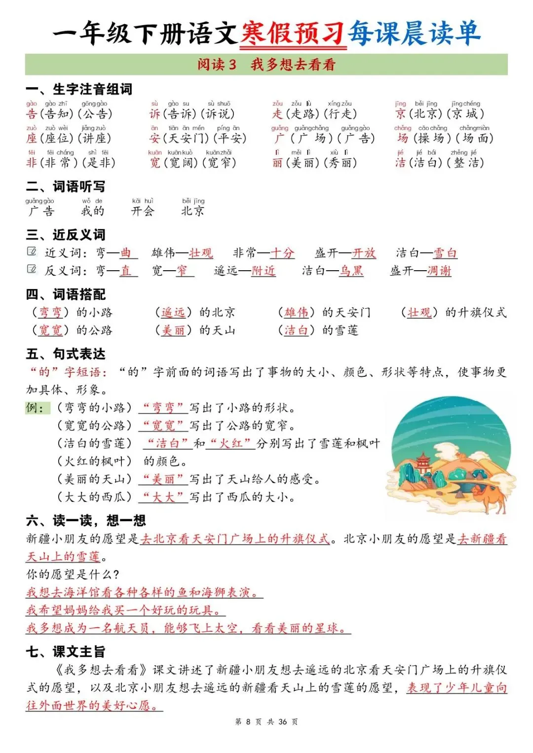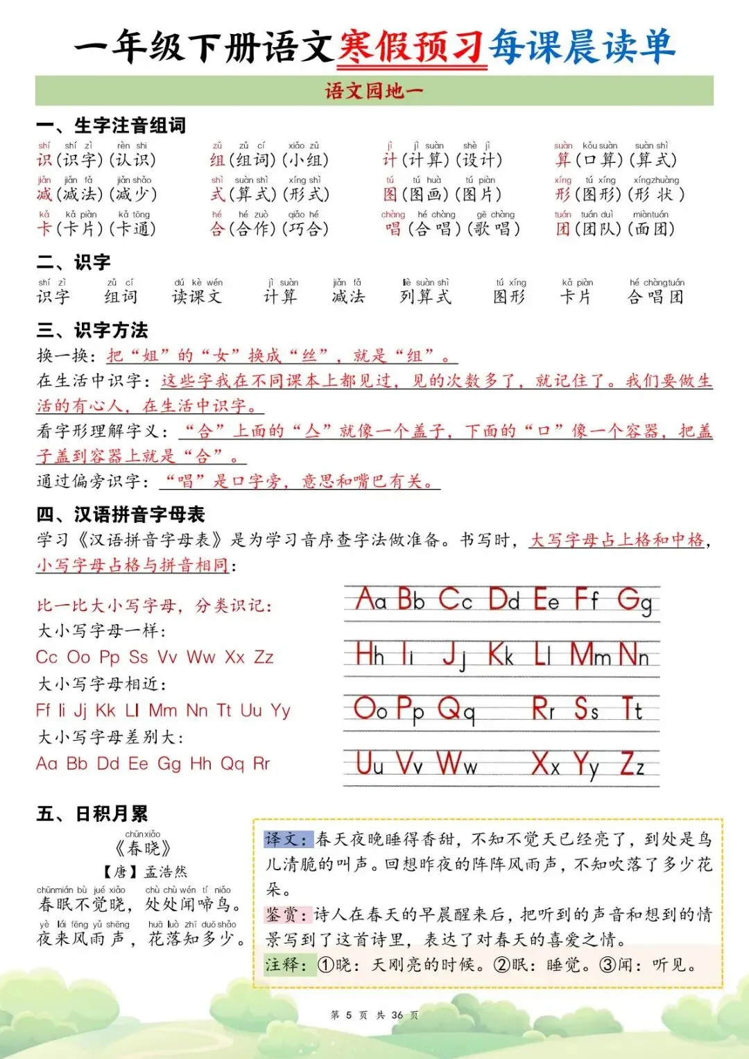 26春一年级下册语文每课晨读单,共36页,电子版,支持下载打印。包含全生字注音组词、多音字、词语扩展、词语搭配、古诗译文、句子仿写、课文主旨等内容,立即打印这份精心整理的晨读宝典,让孩子从容走进新学期,在积累中提升语文素养!