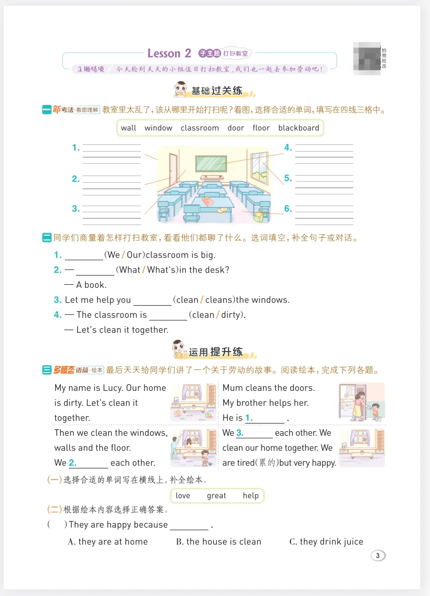 这份三年级英语下册同步练习来啦!适配人教精通版,聚焦教室物品与方位表达等核心考点。内容覆盖基础过关与运用提升模块,搭配趣味插图,从单词填空、情景判断到对话补全,层层夯实 in/on/under 用法。还附单元目标导览,帮孩子明确学习重点。适合孩子课后巩固,家长辅导超省心!