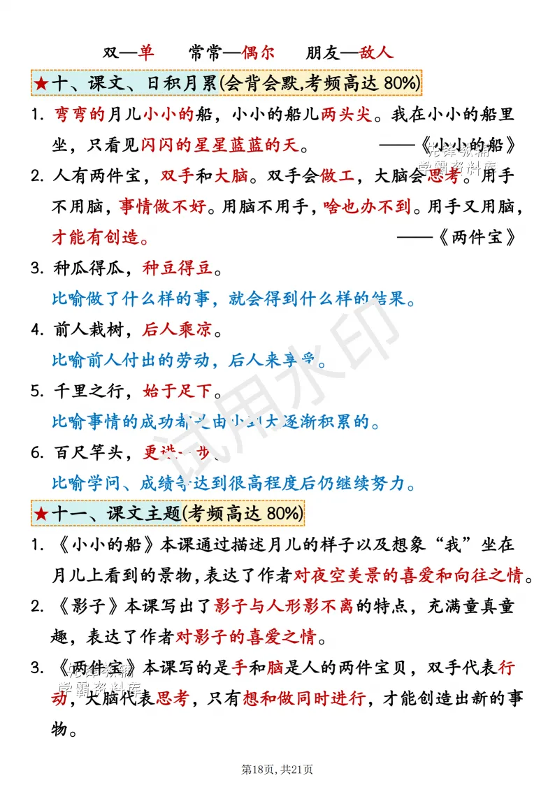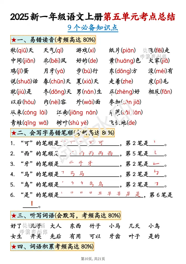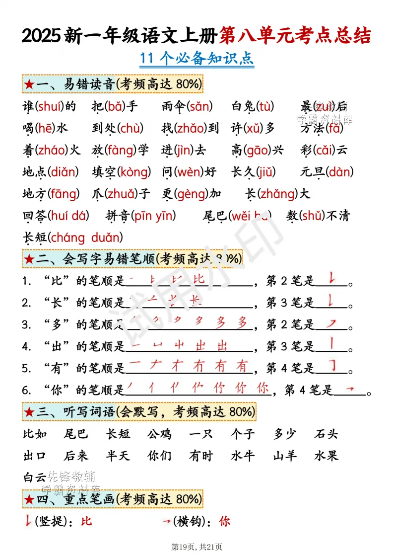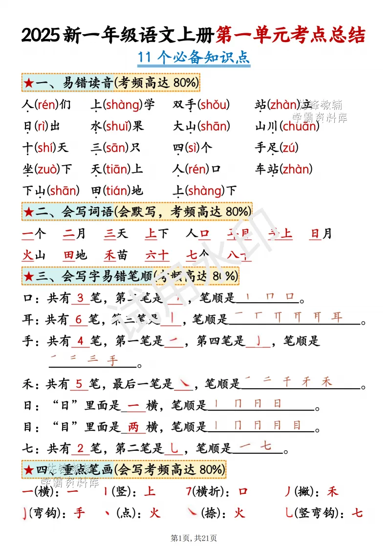 一年级上语文《1~8单元考点总结》能让孩子们提升: