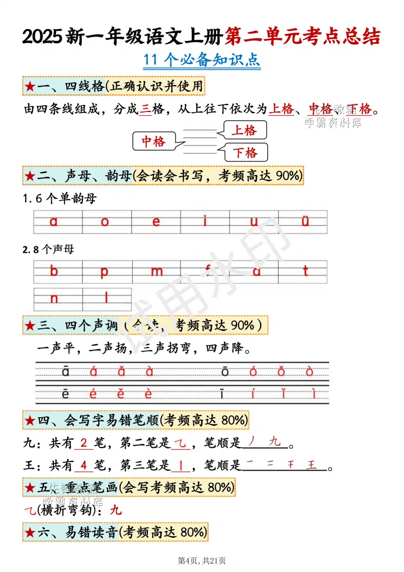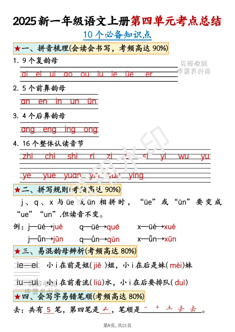 **一、拼音**:掌握声母、韵母、整体认读音节,准确拼读、书写,区分易混发音。
