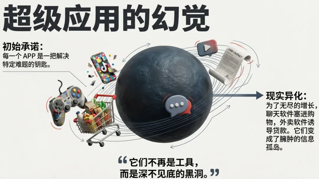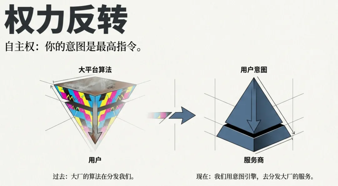 当意图可以直接被解析和执行时,商业世界的底层架构将发生天翻地覆的改变。在传统的 APP 时代,资源是割裂的。你在 A 平台的数据,B 平台无法调用。你在 C 平台养成的偏好,D 平台一无所知。你被迫在不同的孤岛之间来回跳跃,疲于奔命。而在“意图引擎”的视角下,所有的 APP 都将被降维成“无头服务(Headless Services)”或纯粹的 API(应用程序接口)。想象这样一个场景:你不再需要点开手机上的任何图标。你只需向你的设备(也许是一副眼镜,也许是手机锁屏上的一个常驻后台引擎)下达指令:“帮我订一张下周三去上海的机票,要求上午出发,靠窗,如果同一时间段高铁更便宜且总耗时相差不超过一小时,就买高铁。”在这个过程中,你的“意图引擎”会在极短的时间内在后台并发访问携程、飞猪、12306 以及各大航司的底层接口。它会替你比价,替你考虑通勤时间,替你权衡性价比。然后,它直接调用你的支付授权,完成购买,并将行程自动写入你的日历。在这个闭环里,携程和飞猪的漂亮界面毫无用武之地。它们从“垄断用户入口的平台”,退化成了“单纯提供车票数据的供应商”。这是一次伟大的权力反转。过去,是大厂的算法在分发我们;现在,是我们用自己的意图引擎,去分发大厂的服务。当你建立起属于自己的“意图分发中心”时,你就不再受制于任何单一的封闭生态。你的意图是最高指令,所有的商业服务都必须像仆人一样,在后台默默响应你的召唤,而不是在前端张牙舞爪地抢夺你的眼球。
