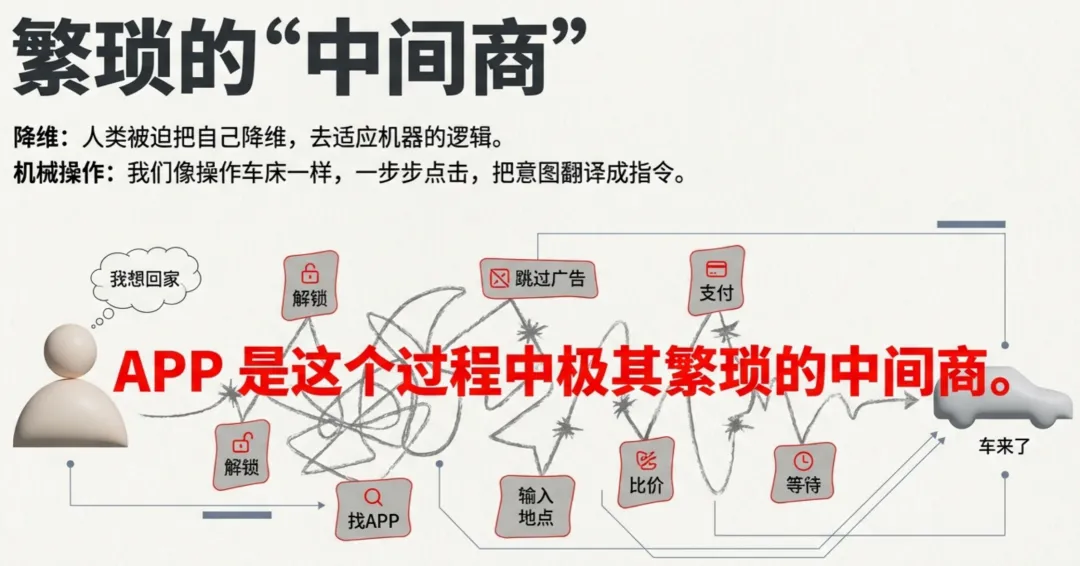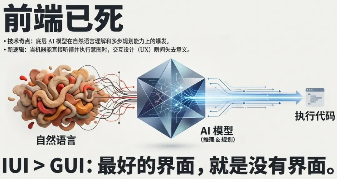 如果我们退后一步,来思考:我们真的需要 APP 吗?不,人类从来不需要任何 APP,人类需要的只是“达成意图”。你不需要一个打车软件的华丽界面,你的意图只是“从 A 点移动到 B 点”;你不需要一个外卖软件的满减算法和凑单逻辑,你的意图只是“我饿了,想吃一份热腾腾的牛肉面,且预算在 30 元以内”;你不需要打开五个电商平台去比价,你的意图只是“以最合理的价格买到一卷卫生纸”。在过去,因为机器是“愚蠢”的,它听不懂人类模糊的、充满上下文的自然语言意图。所以,我们被迫发明了 GUI(图形用户界面),发明了菜单、按钮和下拉列表。人类被迫把自己降维,去适应机器的逻辑。 我们像操作车床一样,一步步点击,把自己的意图翻译成机器能懂的指令。APP,就是这个过程中极其繁琐的“中间商”。但到了 2026 年,随着底层 AI 模型在自然语言理解、逻辑推理和多步规划能力上的彻底大爆发,这个中间商的存在变得极其可笑且多余。当底层的 AI 已经可以完美理解你那句“下雨了,帮我叫辆车回家,要宽敞点的,顺便在路上的咖啡店点一杯热拿铁,我到了刚好能拿”时,为什么你还要被迫打开两个不同的 APP,忍受三次开屏广告,并进行十几次点击?这就是“前端已死”的底层逻辑。 当机器能够直接听懂并执行你的“意图”时,那些曾经被吹捧上天的交互设计、用户体验(UX)、超级应用生态,瞬间失去了意义。未来属于 IUI(Intent User Interface,意图用户界面)。最好的界面,就是没有界面;最伟大的交互,是交互的消亡。