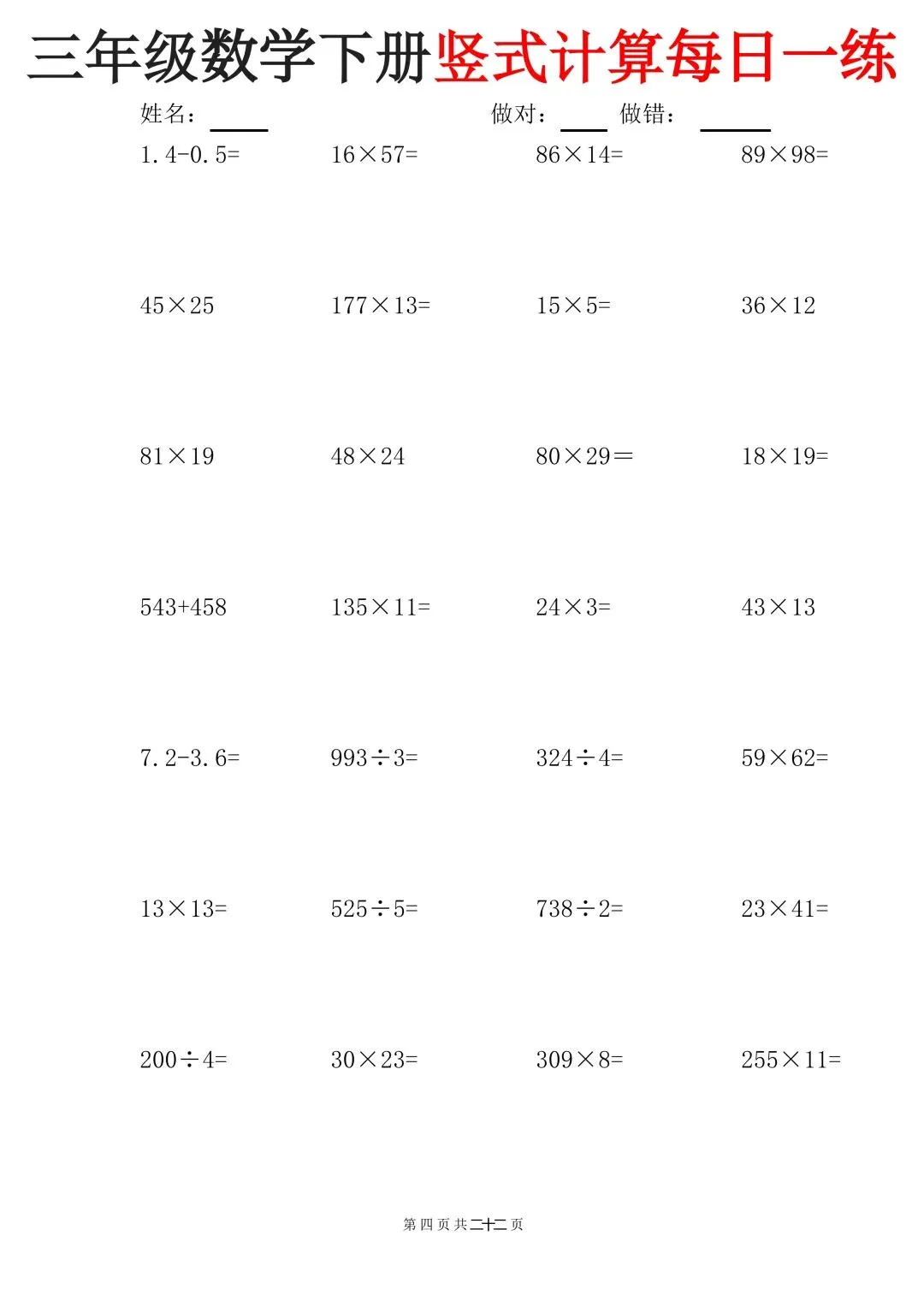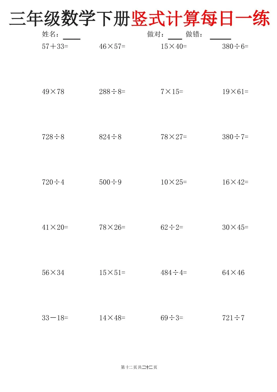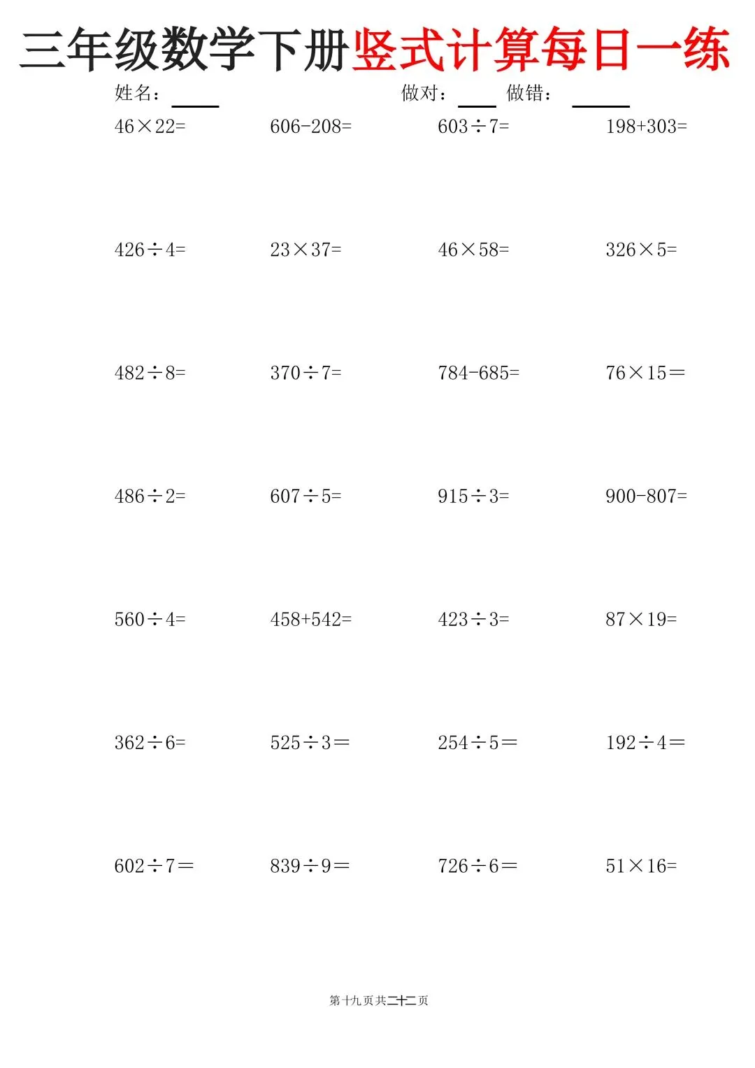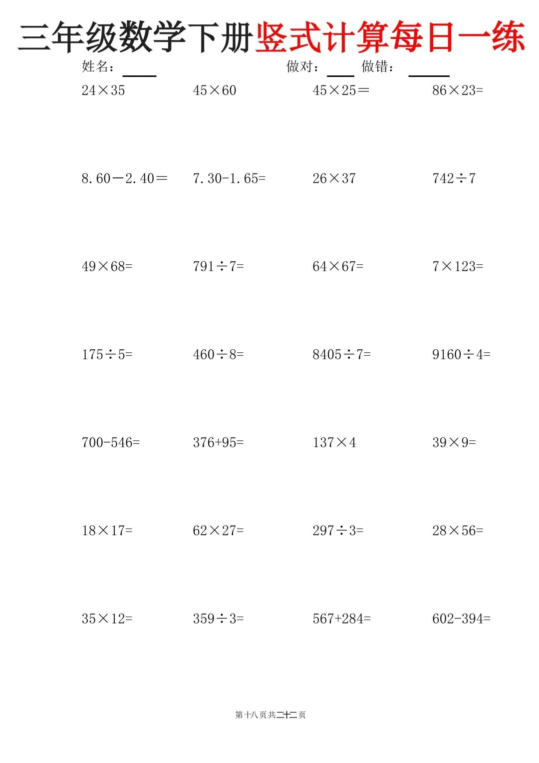 今天安安给大家分享:三年级下册数学竖式计算每日一练,共22页,练习内容紧扣课本知识点,加减乘除竖式全覆盖,题型由浅入深,规范书写步骤。