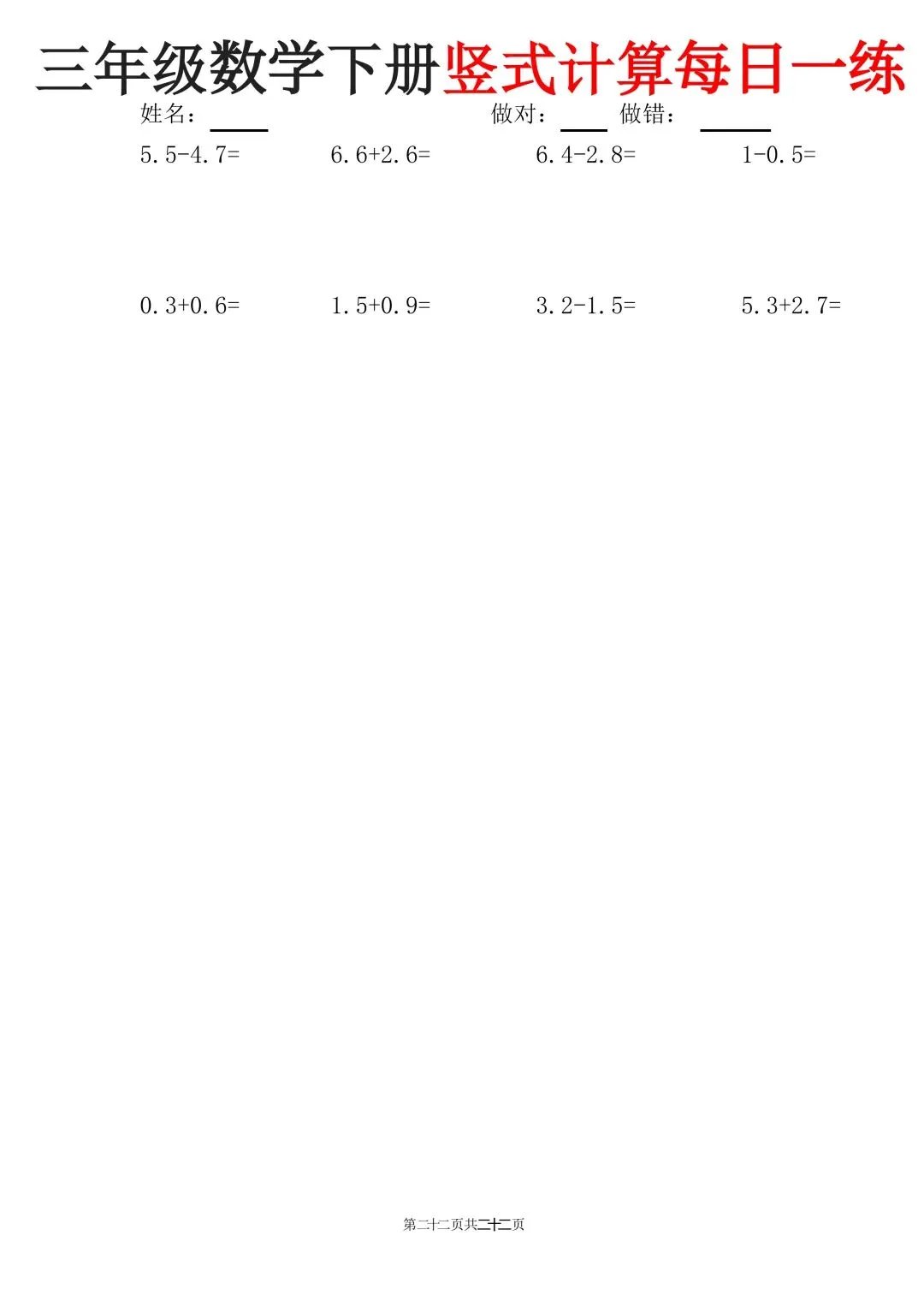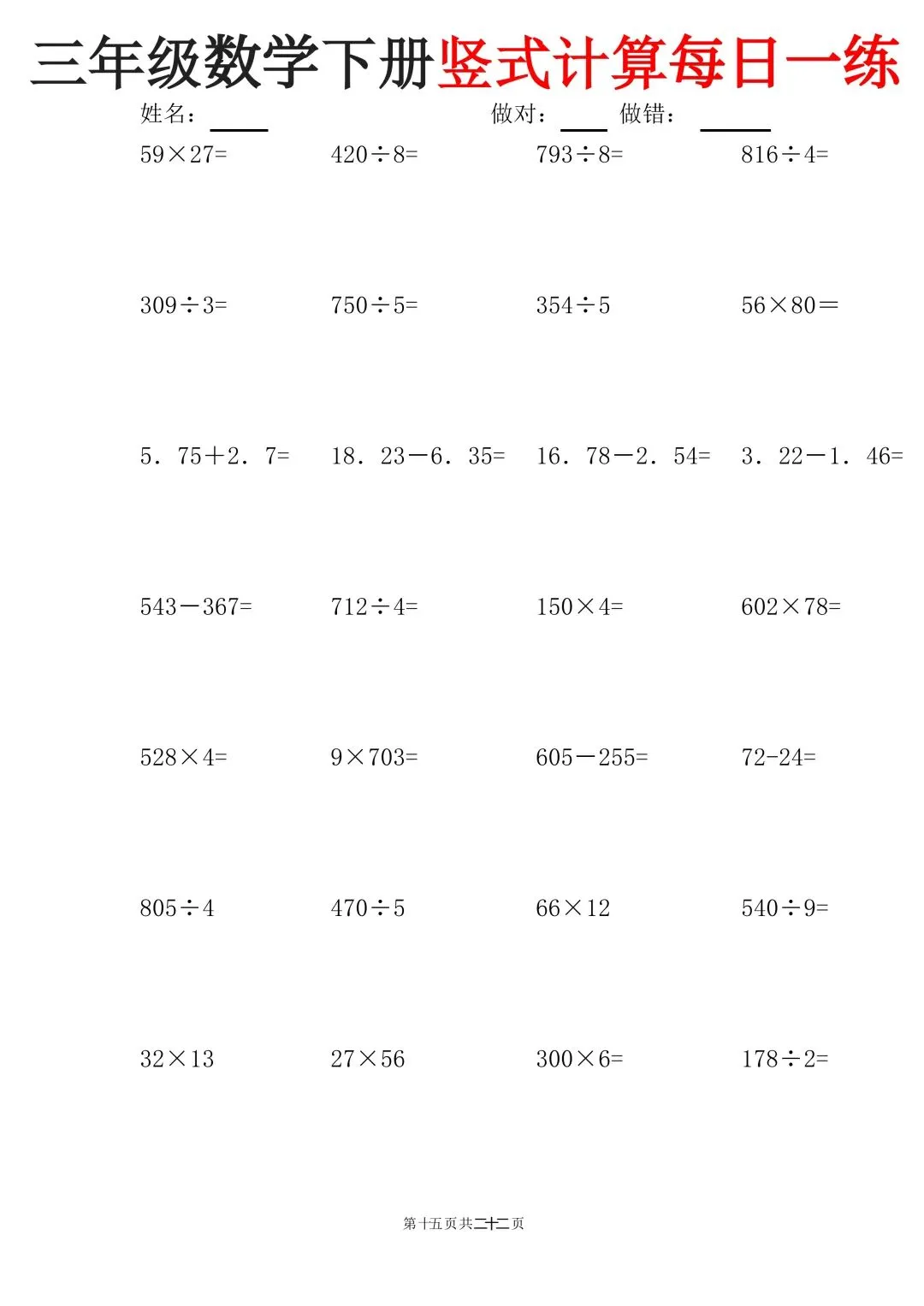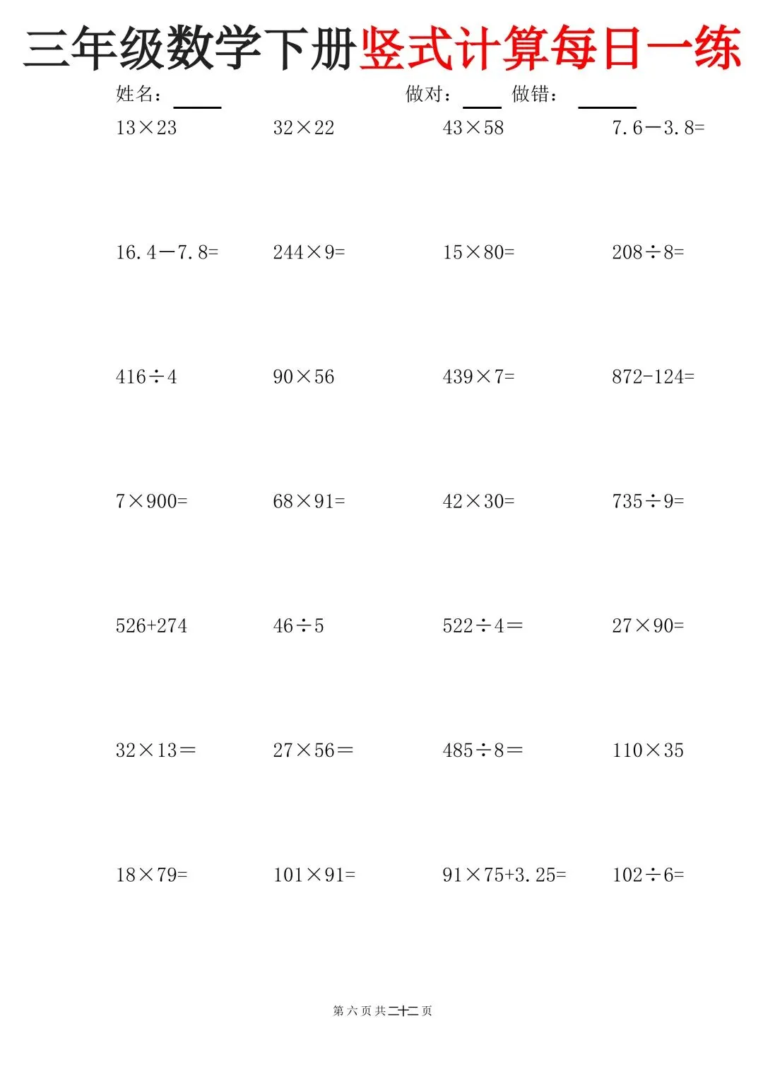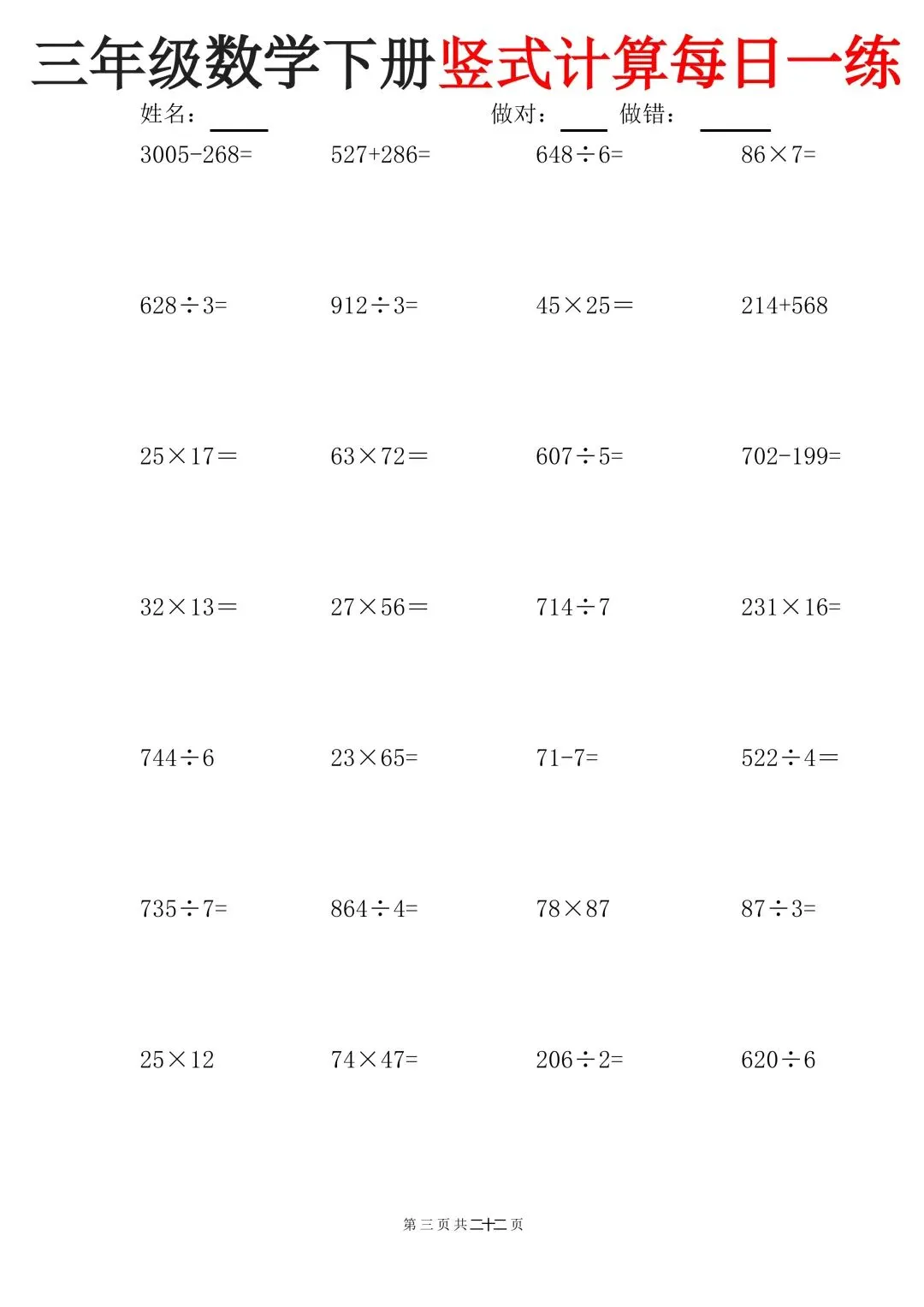 今天安安给大家分享:三年级下册数学竖式计算每日一练,共22页,练习内容紧扣课本知识点,加减乘除竖式全覆盖,题型由浅入深,规范书写步骤。